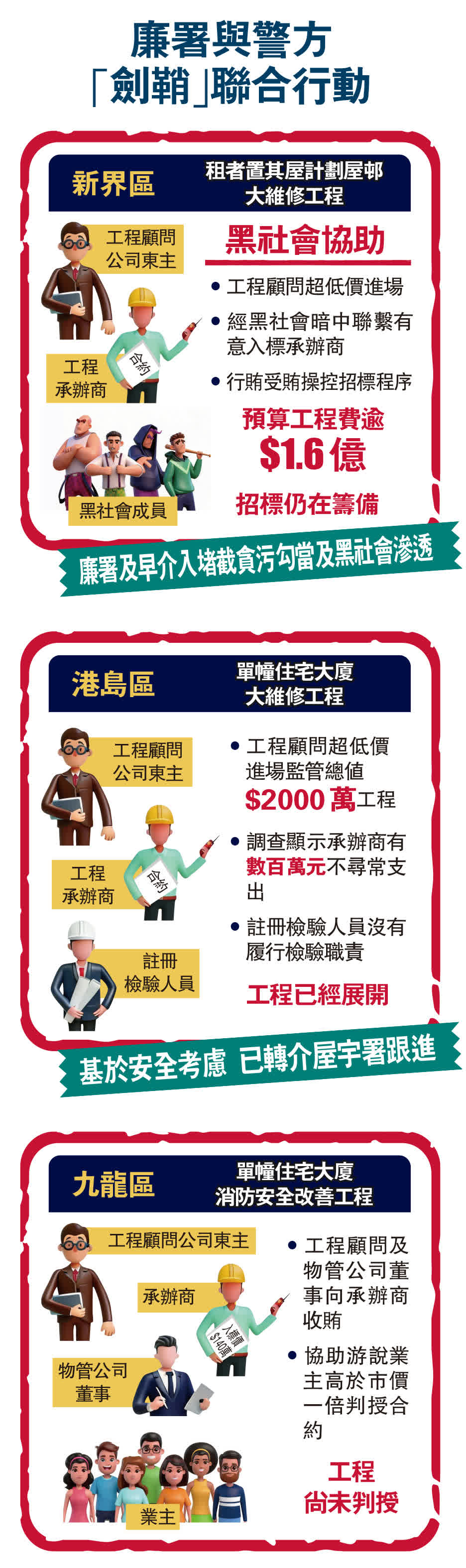 (大公報記者 張真、馮錫雄、姚棠)廉署與警方採取代號「劍鞘」聯合行動,打擊黑社會滲透樓宇維修貪污,搗破一間工程顧問公司,事件涉及港九新界三個項目,工程合約涉款逾1.8億元,拘捕42人。據了解,其中一個維修項目是大埔富善邨,涉案工程顧問公司以遠低於合理水平價格,取得逾1.6億元顧問合約,其後透過多名黑社會成員,賄賂有意投標的承辦商,意圖操控工程招標程序。