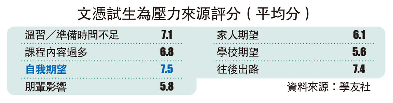 學友社最新公布「文憑試考生壓力調查報告2026」指出,本屆文憑試考生整體壓力平均分為7.1分(10分為極大壓力)。而「自我期望」首次超越其他因素,以高達7.5分的影響程度成為首要壓力源。儘管考生對取得21分以上的期望大幅提升反映了上進心,但學友社呼籲同學善用正向思維,將這份期盼轉化為實際的學習動力。