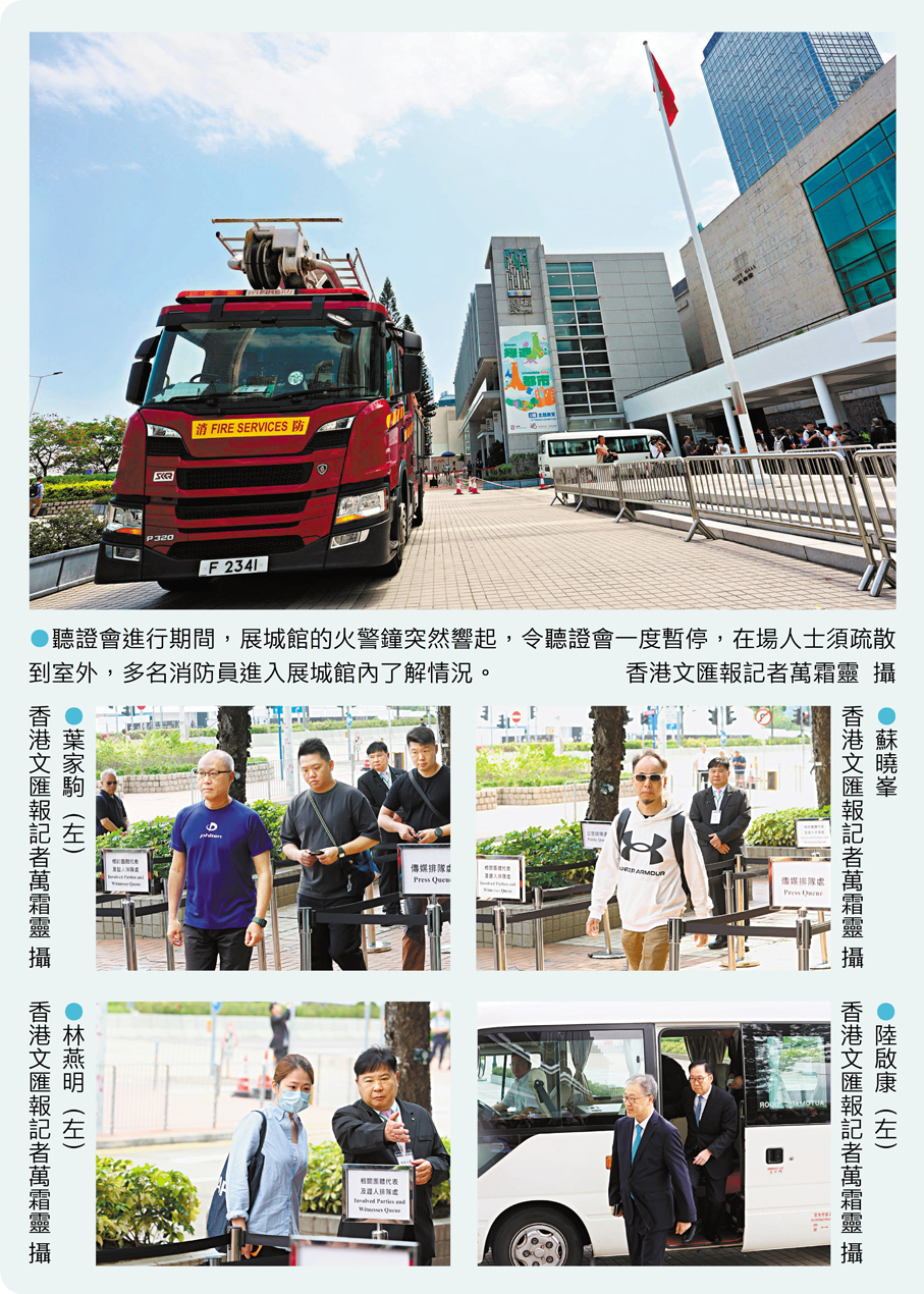 聽證會昨晨小休期間展城館的火警鐘誤鳴,在場人士疏散。獨立委員會主席陸啟康疏散至會場外,大約12時06分,聽證會重新展開。陸啟康感嘆今次事件充分反映警鐘的重要性,又相信在場人士應該都很感慨,假如宏福苑當日火警鐘有響:「咁就好」,「(響警鐘)見到消防很快就來到,好好畀我們反省今次這件事。」