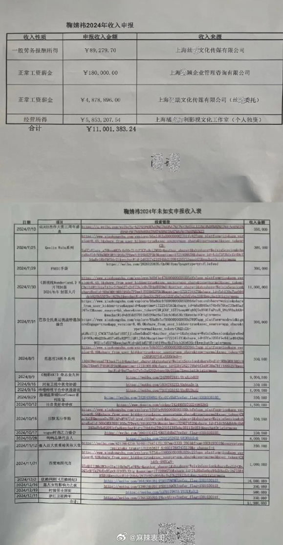 大公文匯全媒體報道,今日(31日),絲芭傳媒實名舉報內地藝人鞠婧禕的舉報信登上熱搜,該舉報信領取日期為2026年3月30日,信上描述鞠婧禕申報1100萬元,實際收入超5000萬元,瞞報比例超過85%。