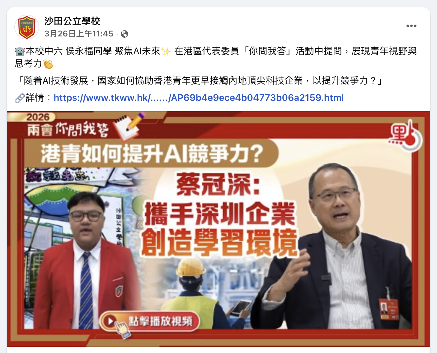 「兩會原來可以同我們那麼近」,沙田公立學校中六學生侯永福對參與活動感受深刻。他形容,自己為將來讀書之後的發展方向而緊張,但透過一問一答,代表委員解釋得很清楚,例如,有代表委員詳細地講解國家發展計劃與大政方針,提醒他們要打好自身基礎,不能單靠人工智能,又提及會同深圳的創科企業合作,安排學生參觀實習。