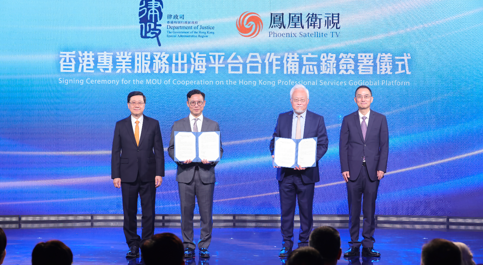 近年來,鳳凰衛視積極拓展國際市場,重點打造國際活動品牌「鳳凰行天下」,助力中國企業對接全球資源。在李家超與徐威的共同見證下,香港特別行政區政府律政司副司長張國鈞與鳳凰衛視執行副總裁楊家強交換「香港專業服務出海平台」合作備忘錄,憑藉鳳凰全球傳播的全媒體優勢,雙方將共同推動香港專業服務與內地企業出海需求的精準對接。