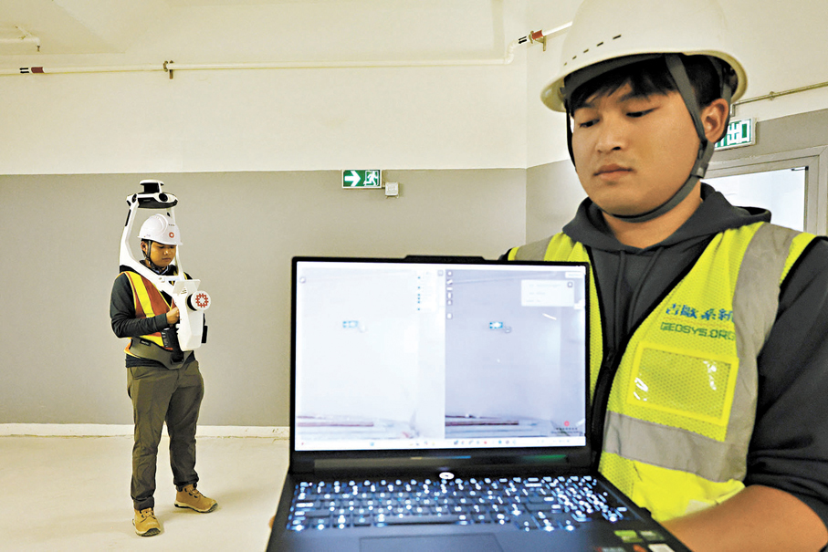房屋署總結構工程師(發展及建築)王偉洪近日接受香港文匯報訪問時介紹,AI移動測繪系統應用「現實捕捉」技術,透過高精度鐳射掃描、全景攝影及多源感測技術,在工地現場快速進行數碼記錄,生成毫米級精度的三維點雲數據模型後,同時工程人員可於線上查看現場紀錄,並核實AI的分析結果,無需親身到場驗收。「過往未有這項技術時,需要數十名工作人員共同核查,耗費大量人力物力,現在系統不僅更安全地核查高空位置,還能在系統畫面中測量距離,清晰查看各項數據。」