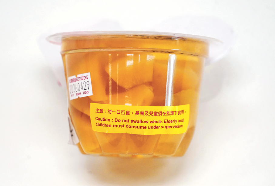 另外,如屬預先包裝食物的、含有蒟蒻的果凍,其銷售包裝的最外層須以中文和英文清楚可閱地標明「注意:勿一口吞食,長者及兒童須在監護下食用。」「Caution: Do not swallow whole. Elderly and children must consume under supervision」,並須標明以上字樣在有關包裝上的顯眼處,並以深色字印在淺色底上或以淺色字印在深色底上的方式標明,以及在字體下劃上底線,或以紅色字印在白色或黃色底上的方式標明。