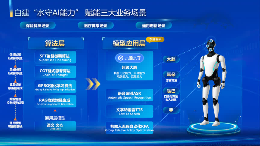 2026年標誌着「AI智能體」元年的真正到來,未來的組織必須進行深刻的數智化重構。為此,水滴公司每年投入近3億元研發費用,組建頂尖複合型團隊,已申請通過人工智能專利100餘項,申請大模型相關專利72項,含境外專利申請9項。構建了名為「水守AI」的自主能力體系,融合了高精度語音交互、自然語言理解與跨智能體協同等能力,使其具備「思考、聽說、做」的擬人化功能,並作為「中樞神經」廣泛應用於核心場景。