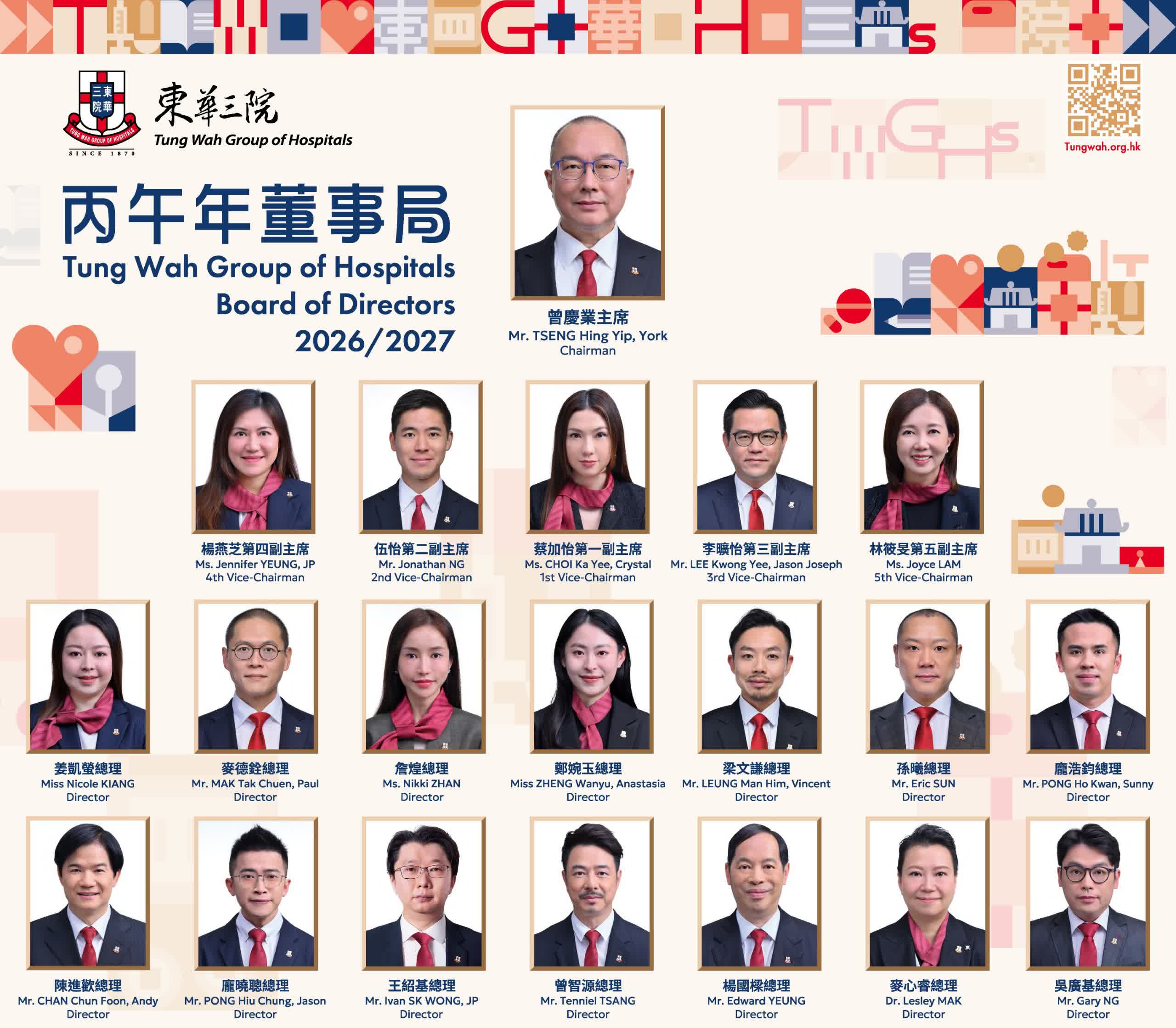 東華三院乙巳年及丙午年董事局交代就職典禮日前於東華醫院地下禮堂舉行,邀得勞工及福利局局長孫玉菡親臨主禮及民政及青年事務局副局長梁宏正主持監誓,標誌着新任董事局肩負管治東華三院的重任,在善業路上力求創新。
