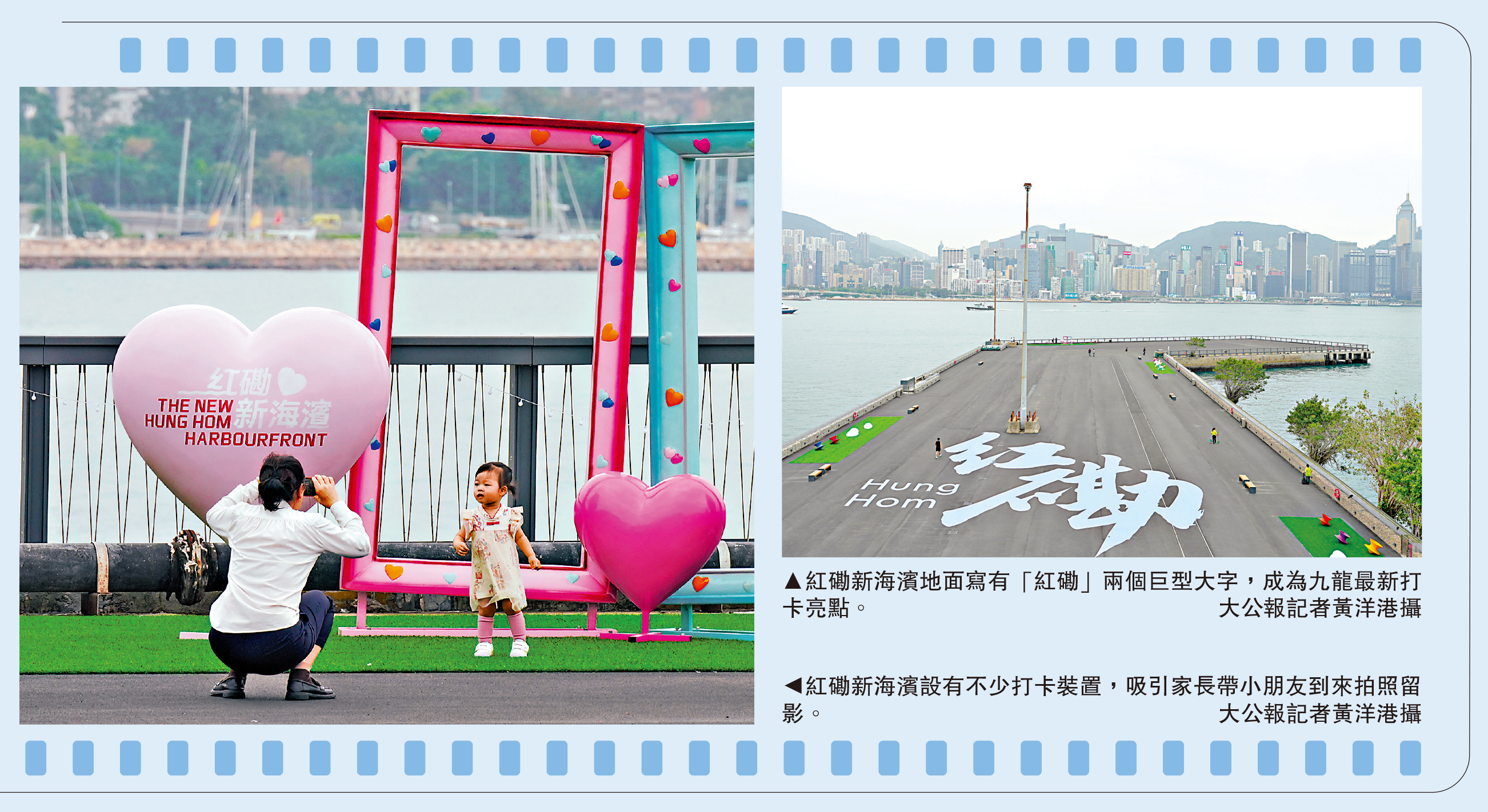 大公報記者昨日從天橋俯瞰,開放區域是呈「L」字形的長條形空間,三面環水,黑色地面將天藍色的「紅磡」二字襯托得十分奪目,與維港海水的藍色相呼應。步行至「L」字形末端,彷彿置身海面之上,伴隨着徐徐涼風,可270度飽覽維港景色,將中環、灣仔、銅鑼灣、尖沙咀沿岸風景盡收眼底。而面向紅磡海濱公園方向,可眺望日出。