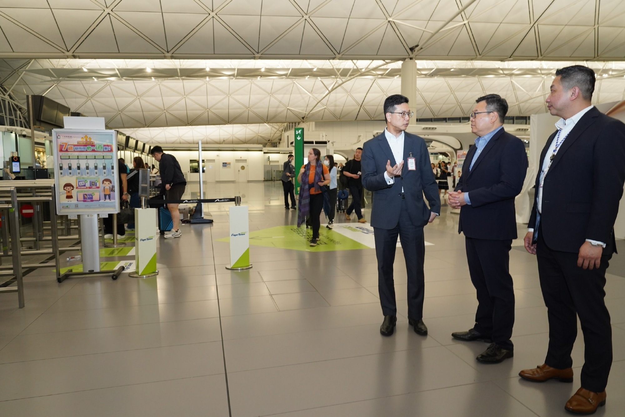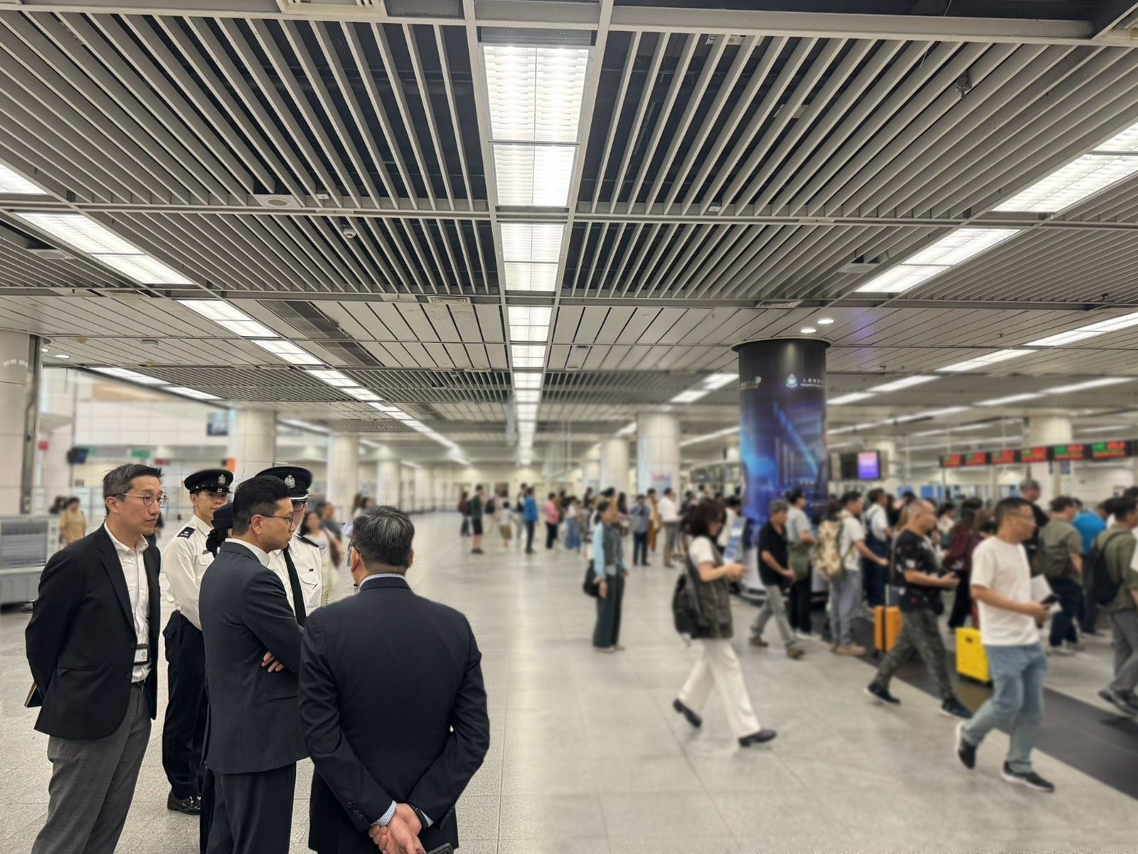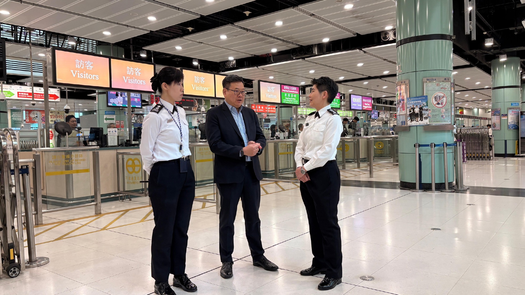 副處長(管制、簽證及證件)程和木與助理處長(管制)樊曉聲一連兩天分別前往了機場、香園圍、落馬洲支線和深圳灣管制站,實地視察並了解應對客流車流的準備工作,並為前線同事打氣,確保各個管制站準備就緒。我們入境處同事會全力以赴,堅守崗位,在假期期間繼續為香港居民和訪港旅客提供優質便捷的出入境服務。