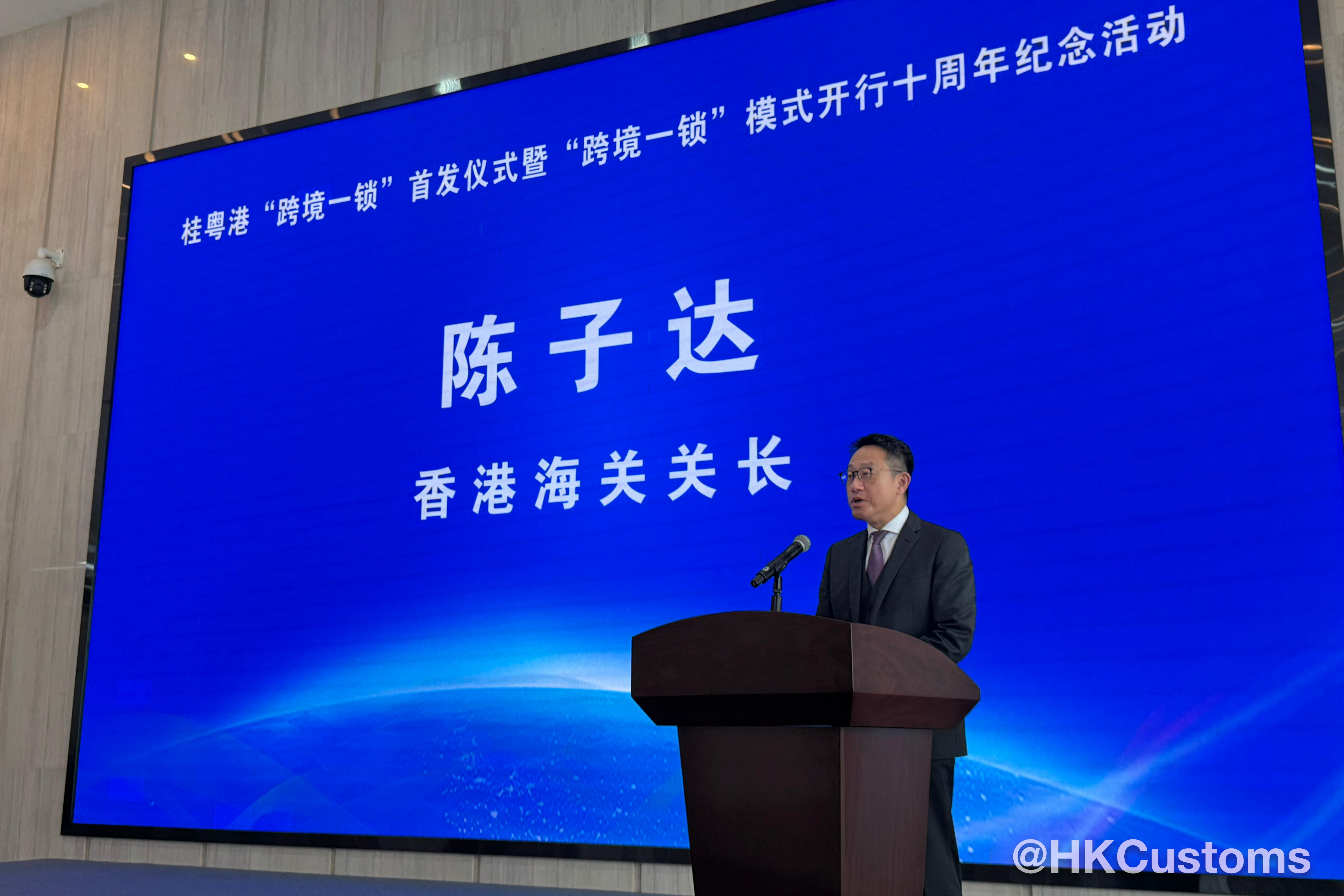 另外,陳子達於三月二十五日在廣西梧州出席桂粵港「跨境一鎖」首發儀式暨「跨境一鎖」模式開行十周年紀念活動。陳子達在致辭時指,南寧關區正式開通首個「跨境一鎖」清關點,有助進一步強化香港和廣西作為區域物流樞紐的重要角色,實現兩地貿易互利共贏。