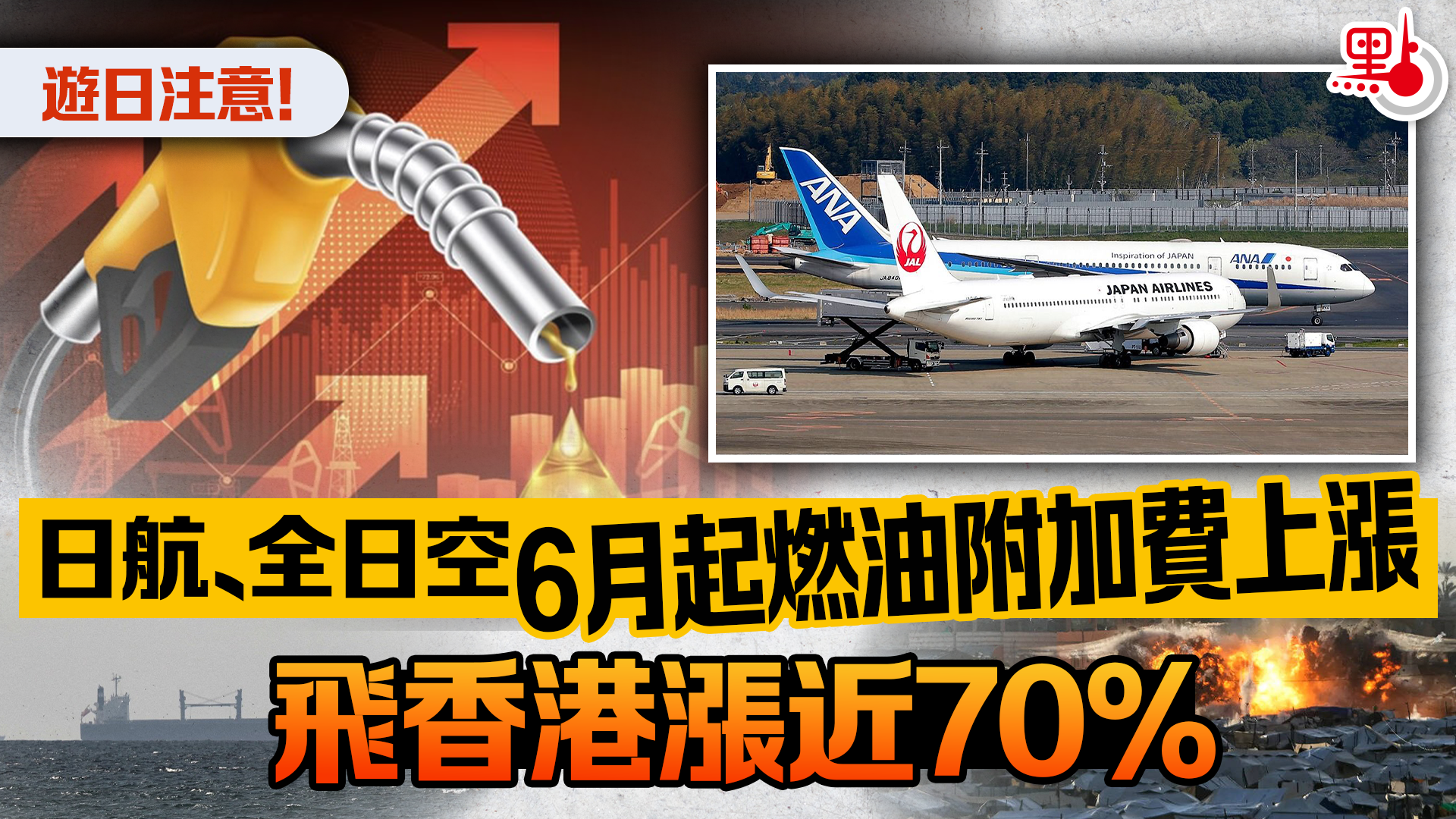 大公文匯全媒體報道,中東衝突導致國際原油與航空燃料價格大漲,日本兩大主要航空公司全日空(ANA)及日本航空宣布,將調高國際線機票燃油附加費。其中飛往中國,包括內地、台灣及香港的航線,全日空會加4,900日圓至14,300日圓(約241至703港元),漲幅52%。而日航則加5,000日圓至12,400日圓(約246至610港元),漲幅68%。