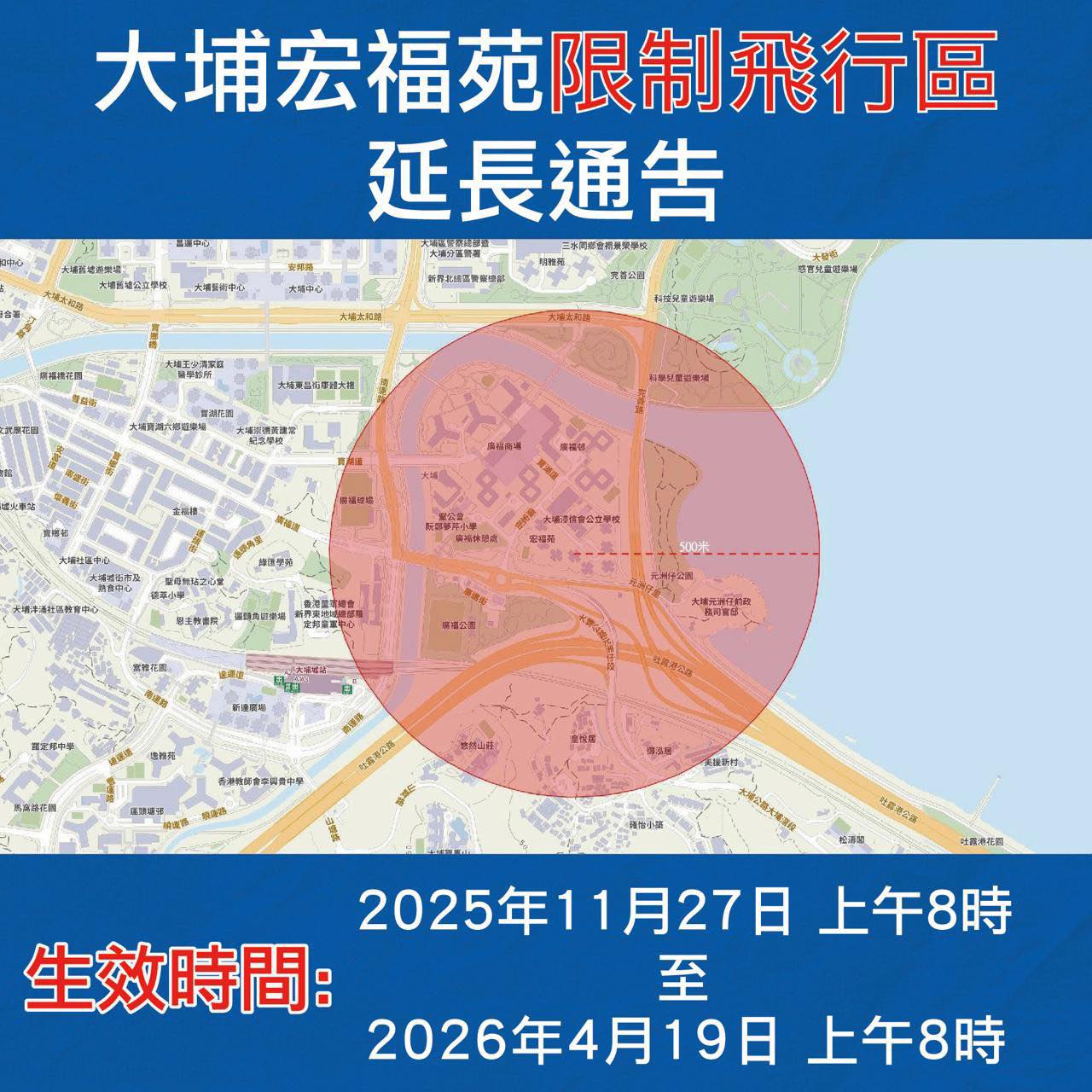 大公文匯全媒體報道,警方今日(4月2日)表示,鑒於公眾安全,警務處在大埔宏福苑範圍已設立「限制飛行區」。時間將由2026年4月5日上午8時延長至2026年4月19日上午8時。