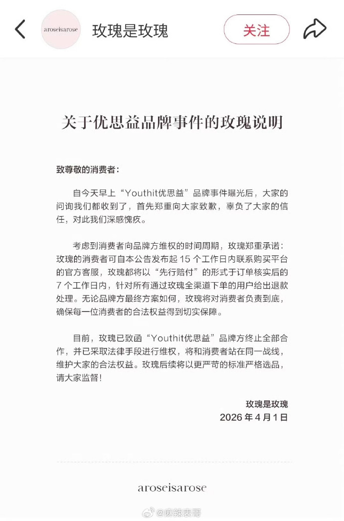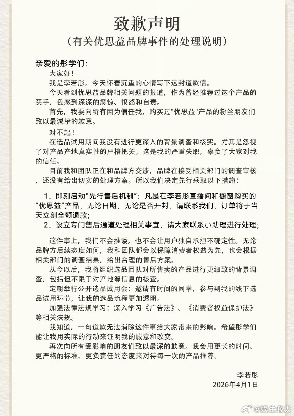 事件曝光後,4月1日,演員李若彤發布致歉聲明稱,在選品試用期間未進行深入的背景調查和產地核實,「這是嚴重失職」。她宣布啟動「先行售後機制」,凡在其直播間和櫥窗購買優思益產品的消費者,無論日期、是否開封,均可聯繫並當天全額退款。