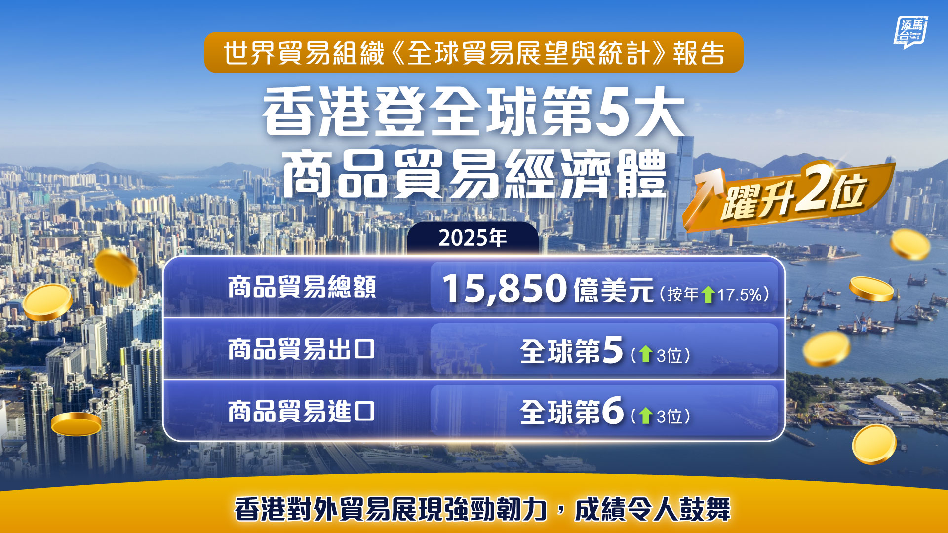 根據世界貿易組織發表的《全球貿易展望與統計》報告,在2025年,香港是全球第5大商品貿易經濟體,較前一年躍升兩位,緊隨中國內地、美國、德國與荷蘭。若將歐盟視作單一貿易經濟體,香港位列全球第4。看圖了解更多。