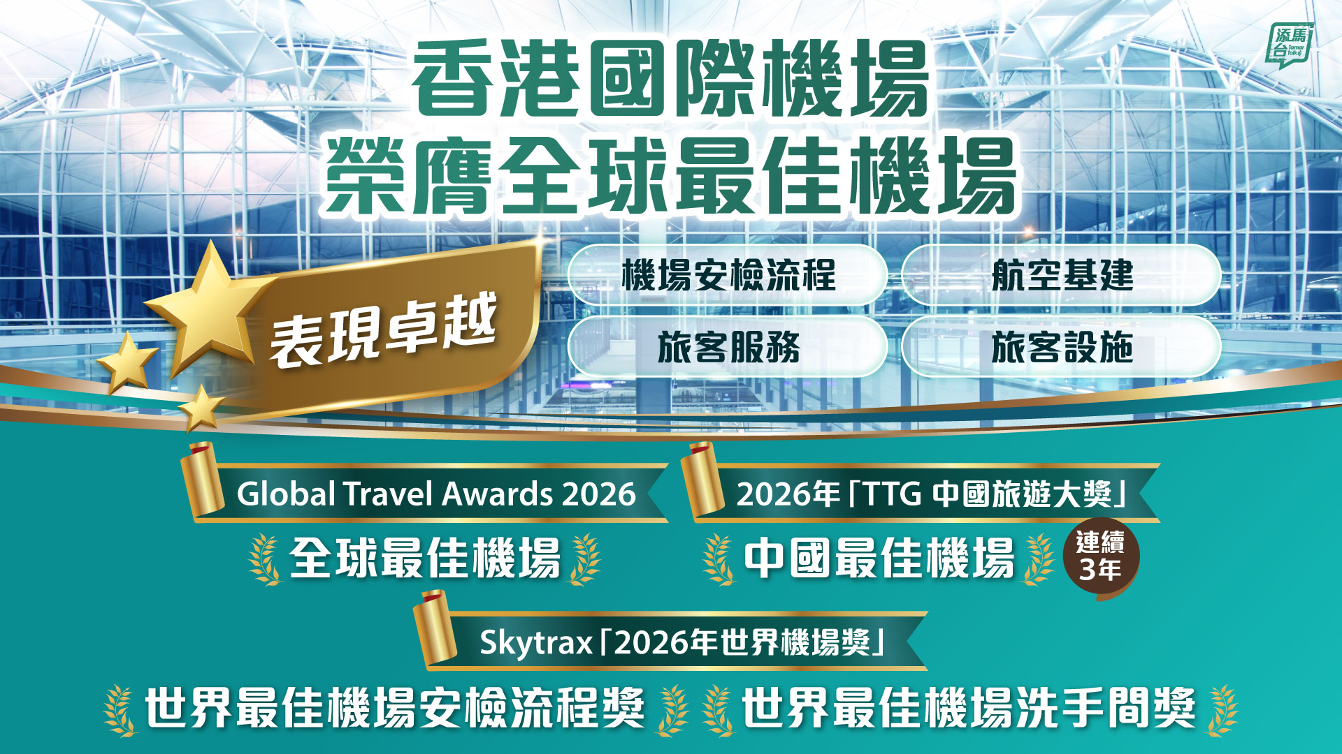 此外,香港國際機場在Skytrax「2026年世界機場獎」囊括「世界最佳機場安檢流程獎」及「世界最佳機場洗手間獎」兩項殊榮。