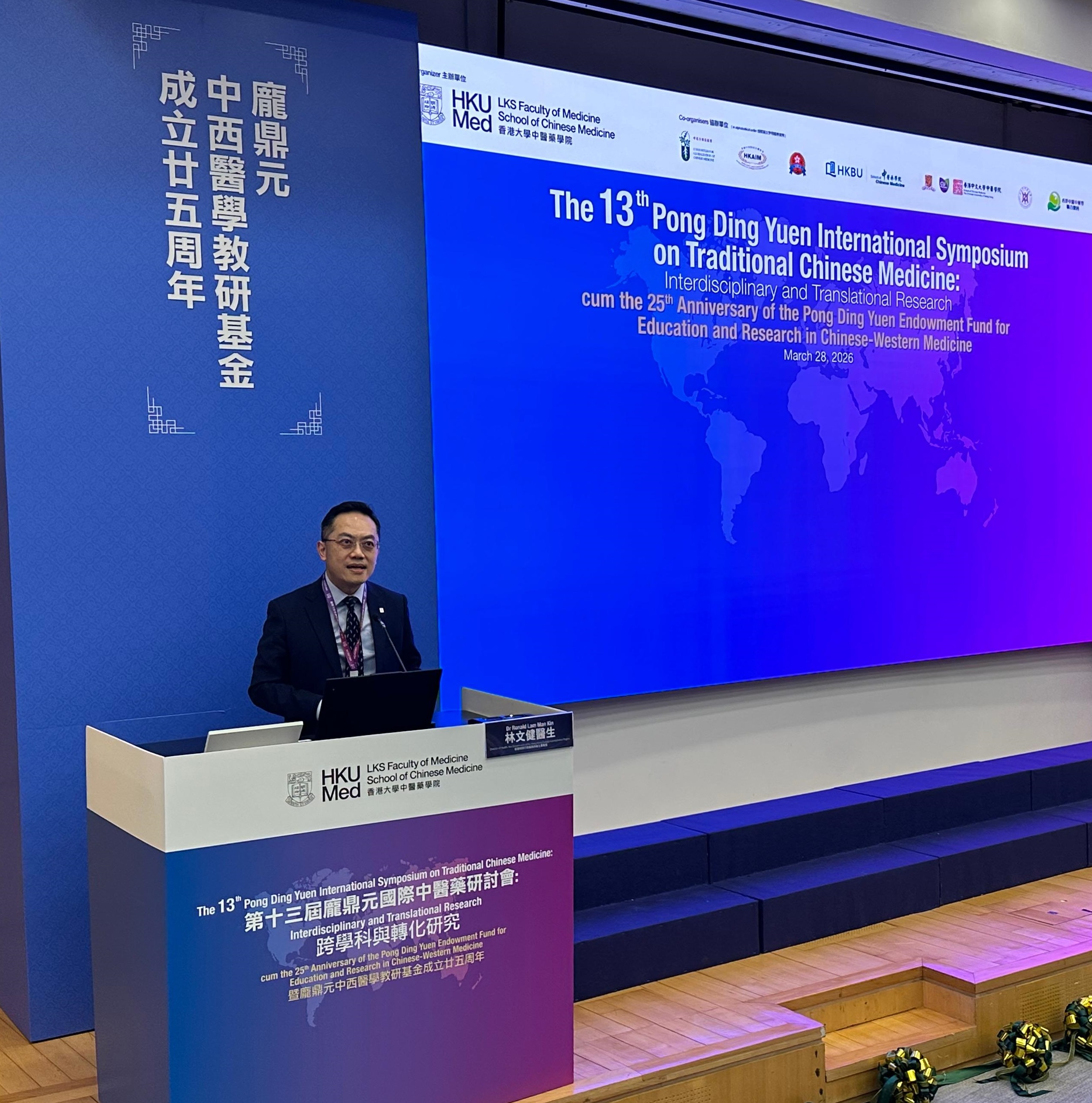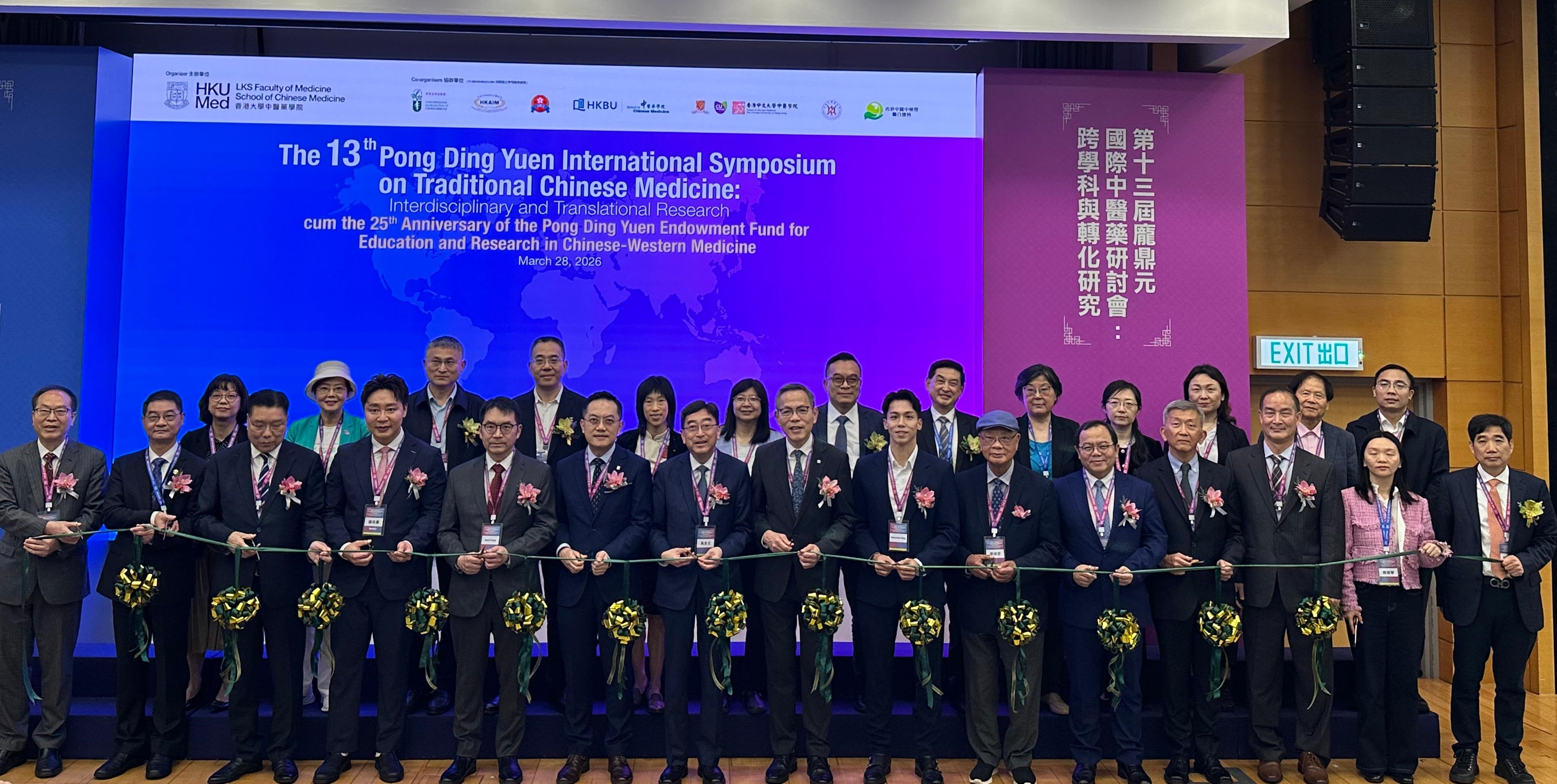 衞生署署長林文健醫生日前為香港大學中醫藥學院主辦的「第13屆龐鼎元國際中醫藥研討會」擔任主禮嘉賓。今屆研討會的主題是「跨學科與轉化研究」,旨在推動中醫藥現代化,這方面與衞生署轄下政府中藥檢測中心(檢測中心)的理念和工作一致。