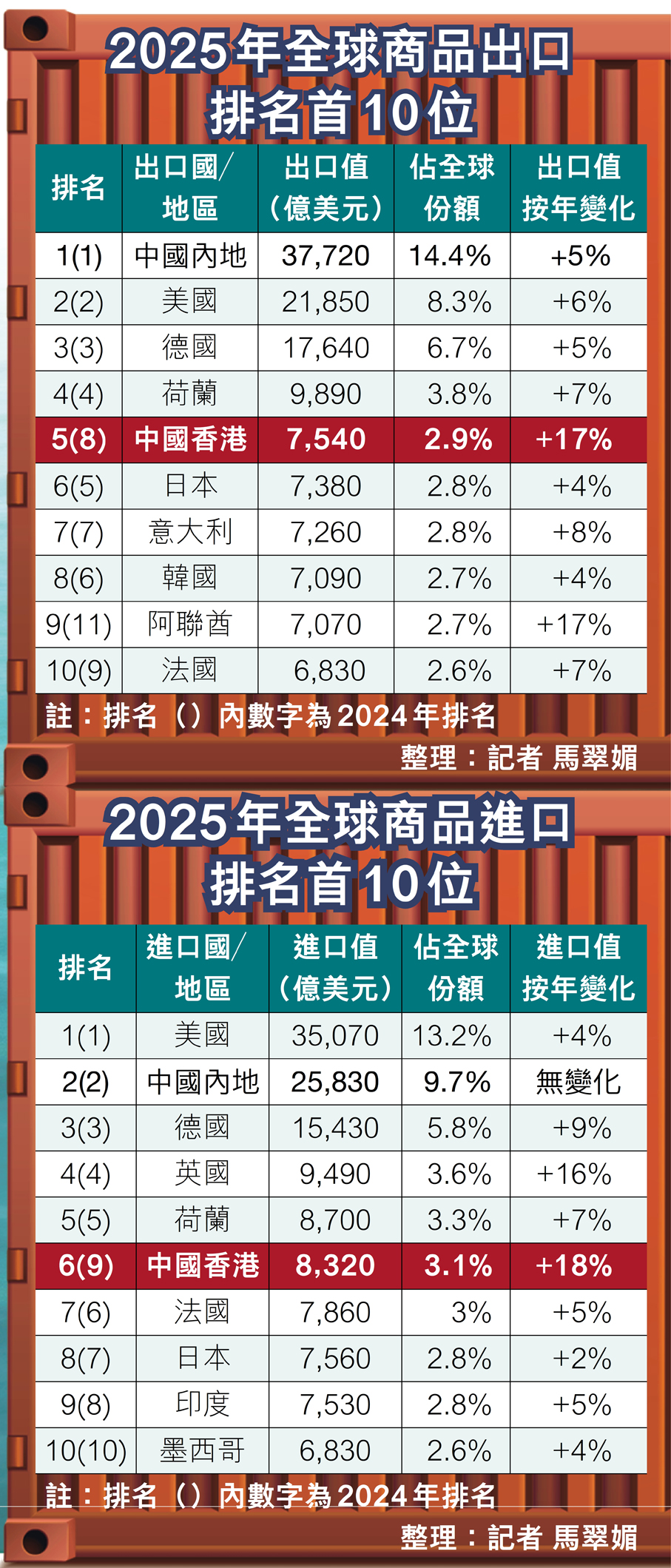 (香港文匯報 記者 馬翠媚、周紹基)中美關稅戰陰晴不定、中東衝突導致油價飆升,令全球貿易前景蒙上陰影。然而,世界貿易組織昨發布《全球貿易展望與統計》的報告顯示,縱然國際經貿前景波譎雲詭,香港仍能化危為機,對外貿易更表現「標青」,本港2025年商品貿易總額按年飆升17.5%至15,860億美元,佔全球總額3%,因而「連升兩級」躋身全球第五大商品貿易經濟體。這組數據不僅印證香港作為國際轉口樞紐的韌性與應變力,亦凸顯本港在全球供應鏈重組中無可替代的關鍵角色。商經局局長丘應樺昨回應指,即使面對地緣政治、貿易保護主義帶來挑戰,本港對外貿易仍展現強勁韌力,又預告年內會助內企「出海」,開拓經濟新增長點。