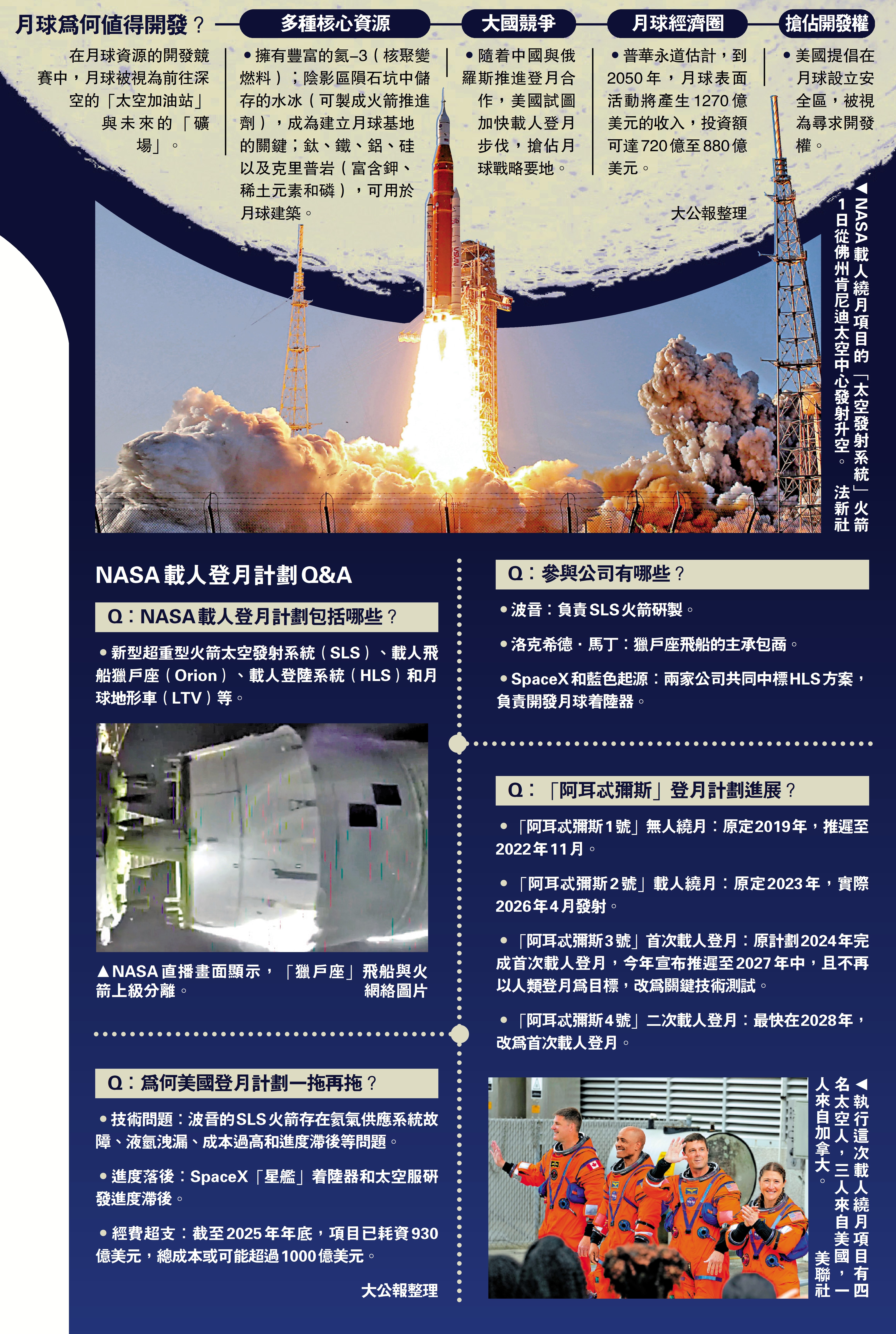 大公報綜合報道,美國太空總署(NASA)在美東時間1日執行「阿耳忒彌斯2號」載人繞月飛行任務,為後續的載人登月進行鋪墊。不過,本次發射任務問題不斷,再次暴露美國登月任務所面臨的多重挑戰。分析指,此次任務的成功與否,將影響美國在新一輪太空競賽中的戰略布局,美國謀求搶佔月球豐富資源的先機。