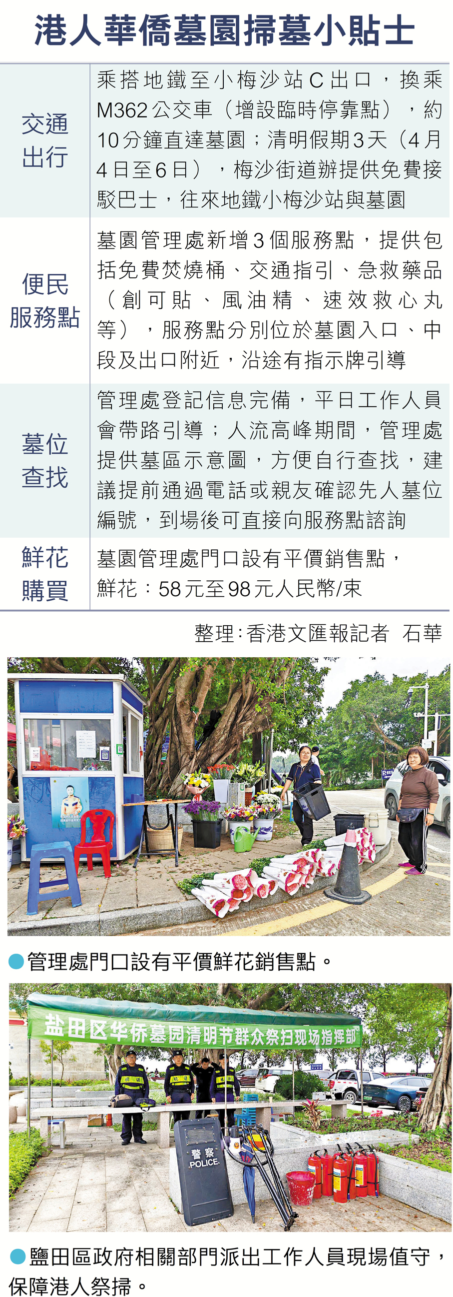 墓園管理處今年增設了3個便民服務點,免費提供焚燒桶、交通指引及急救藥品。祭掃期間,墓園超過70名工作人員全員在崗,鹽田區政府相關部門亦派出百餘人現場值守,消防車、救護車隨時待命。「每個路口都有專人疏導,主要精力放在交通和防火上,確保平安有序。」高帥兵說。