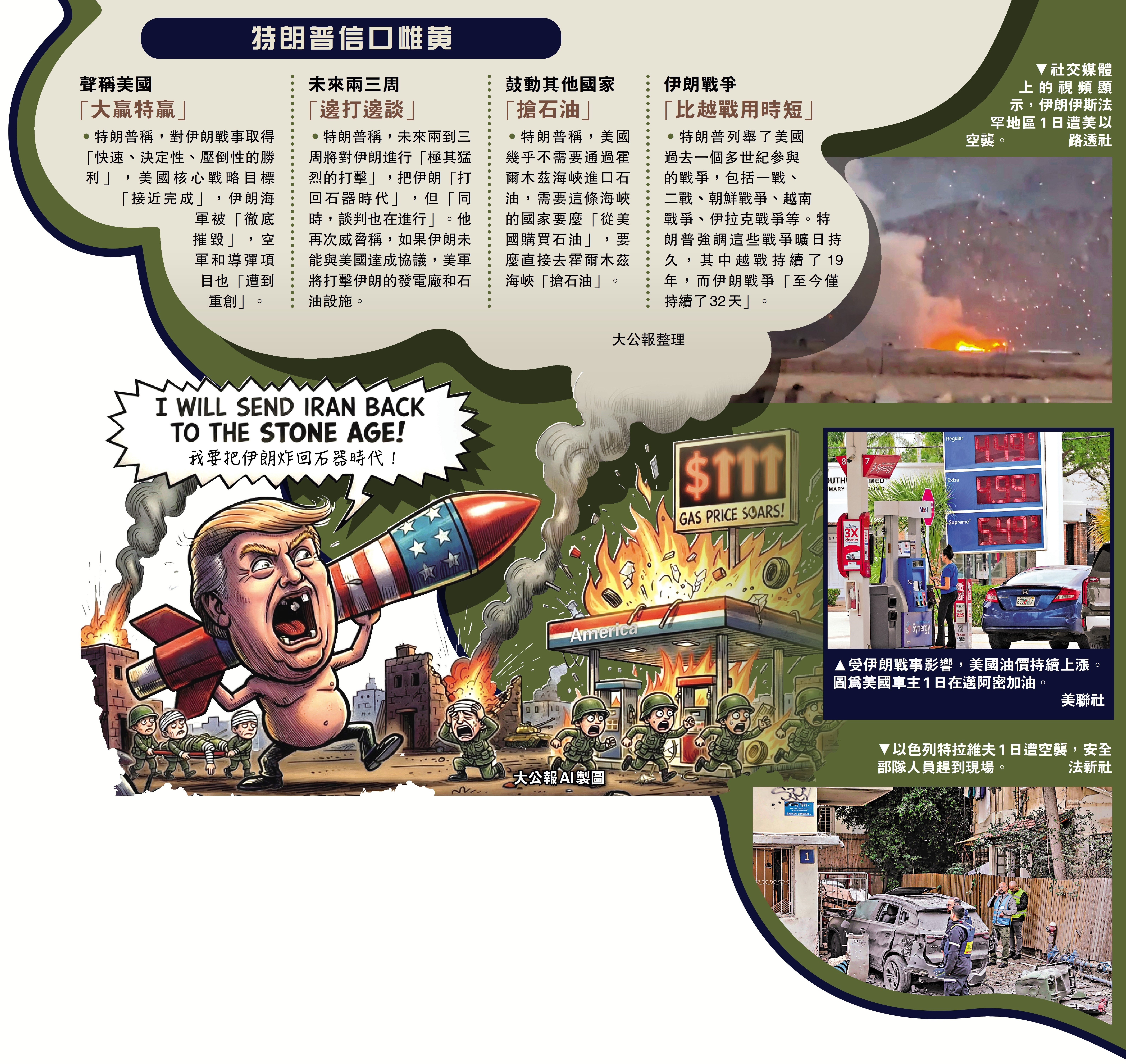 (大公報 記者 郭嘉)當地時間4月1日晚,美國總統特朗普發表對伊朗開戰以來首次黃金時段全國講話,聲稱美國「大贏特贏」。他聲稱將在接下來的兩到三周內繼續猛烈打擊伊朗,但「同時談判也在進行」。這番言論基本上就是特朗普過去一個月社交媒體帖文內容的老調重彈,充斥着不切實際的妄想,既沒有交代戰事如何收場,也未給出明確的結束時間表。伊朗軍方2日表示,美國和以色列對伊朗的作戰能力一無所知,伊朗將繼續戰鬥,直至敵人投降。