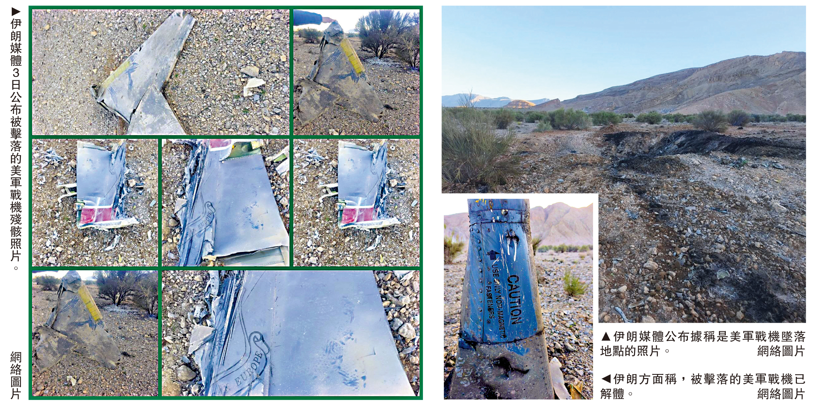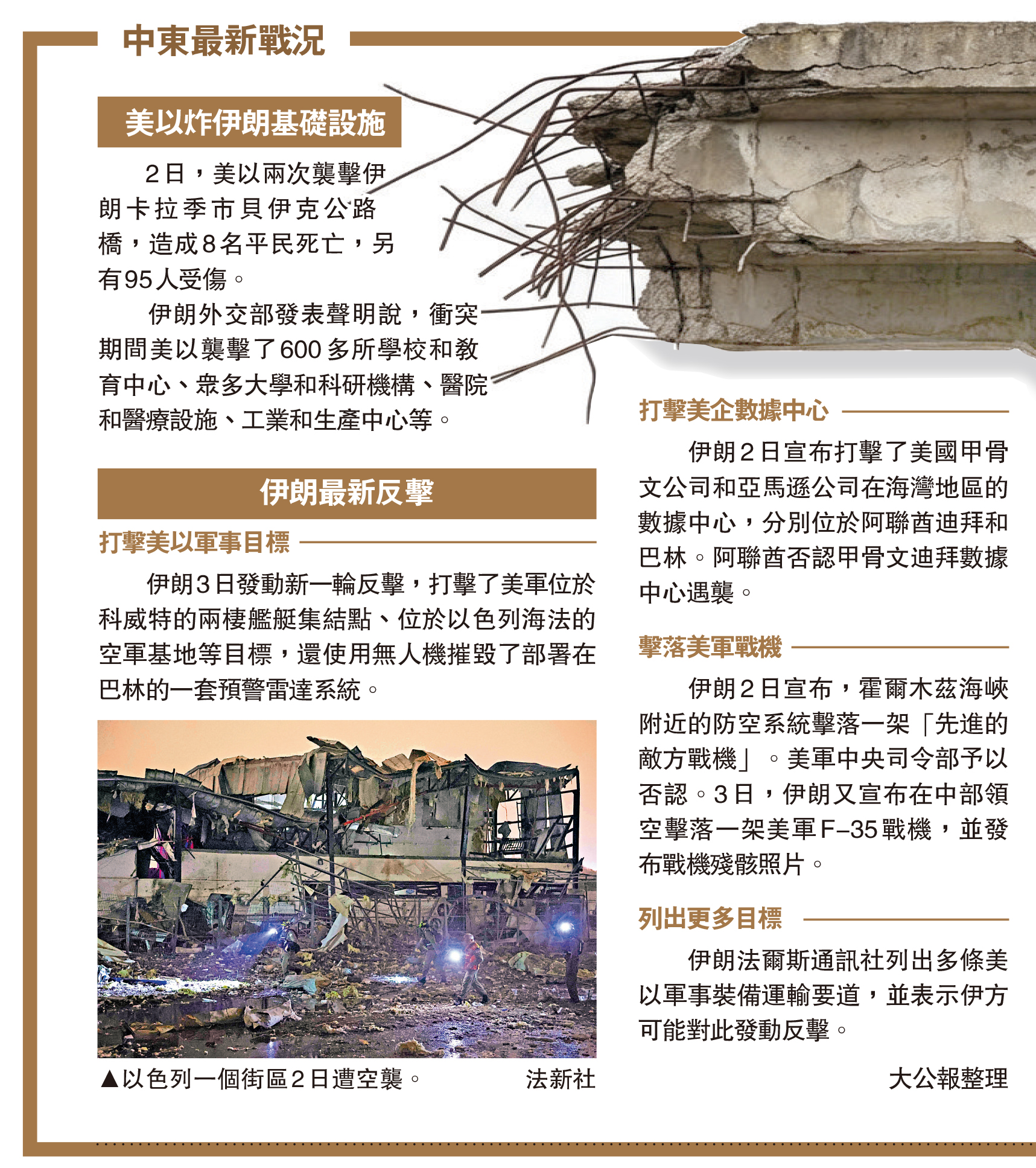 (大公報 記者 郭嘉)美國和以色列對伊朗發動的軍事行動進入第六周之際,伊朗革命衛隊3日稱擊落美國F-35戰機,並公布相關殘骸照片。不過,美國方面否認是F-35被擊落,稱被擊落的是一架F-15E戰機,軍方正緊急展開搜救兩名飛行員。伊朗媒體稱,美方營救行動失敗,懸紅活捉美軍飛行員。美媒隨後引述消息稱,已成功營救出其中一名飛行員,還在尋找另外一人。美國總統特朗普2日繼續威脅炸毀伊朗的大橋和發電廠,伊朗警告說將摧毀美國和以色列在中東地區的所有資產和基礎設施。