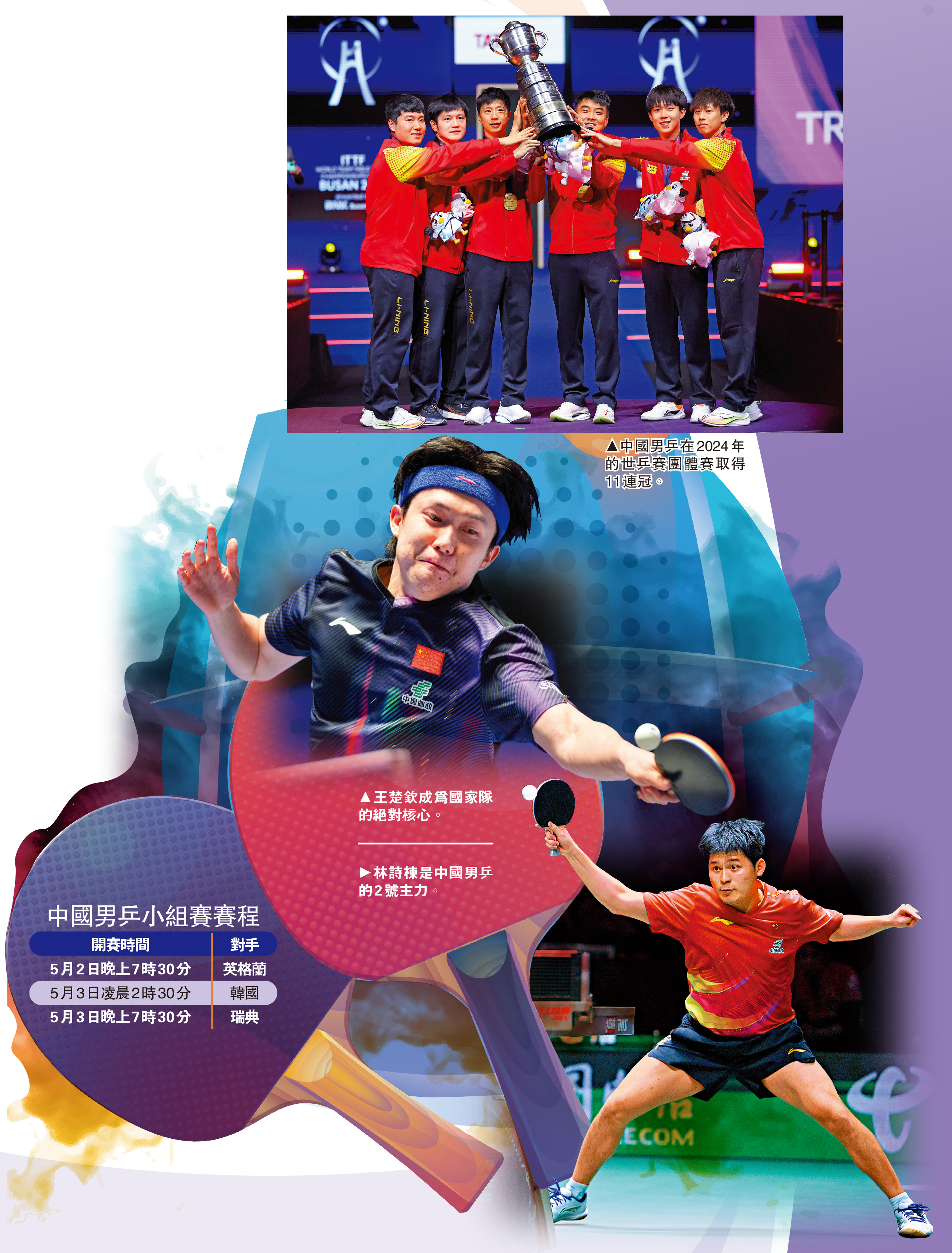 倫敦世乒賽上,頭號種子中國男乒與瑞典隊、韓國隊和英格蘭隊分在一組。除了英格蘭實力偏弱外,由莫雷高德、卡爾伯格領銜的瑞典和張禹珍、安宰賢壓陣的韓國,近年來都曾有在世界比賽中擊敗王楚欽、林詩棟等國乒主力的戰績,中國男乒小組賽並不輕鬆。小組賽雖不淘汰任何一支球隊,但如果在小組賽中意外受挫,中國男乒將很有可能在淘汰賽階段提前遇到日本隊、法國隊、德國隊等主要對手,這對實現衛冕目標帶來更大的挑戰。