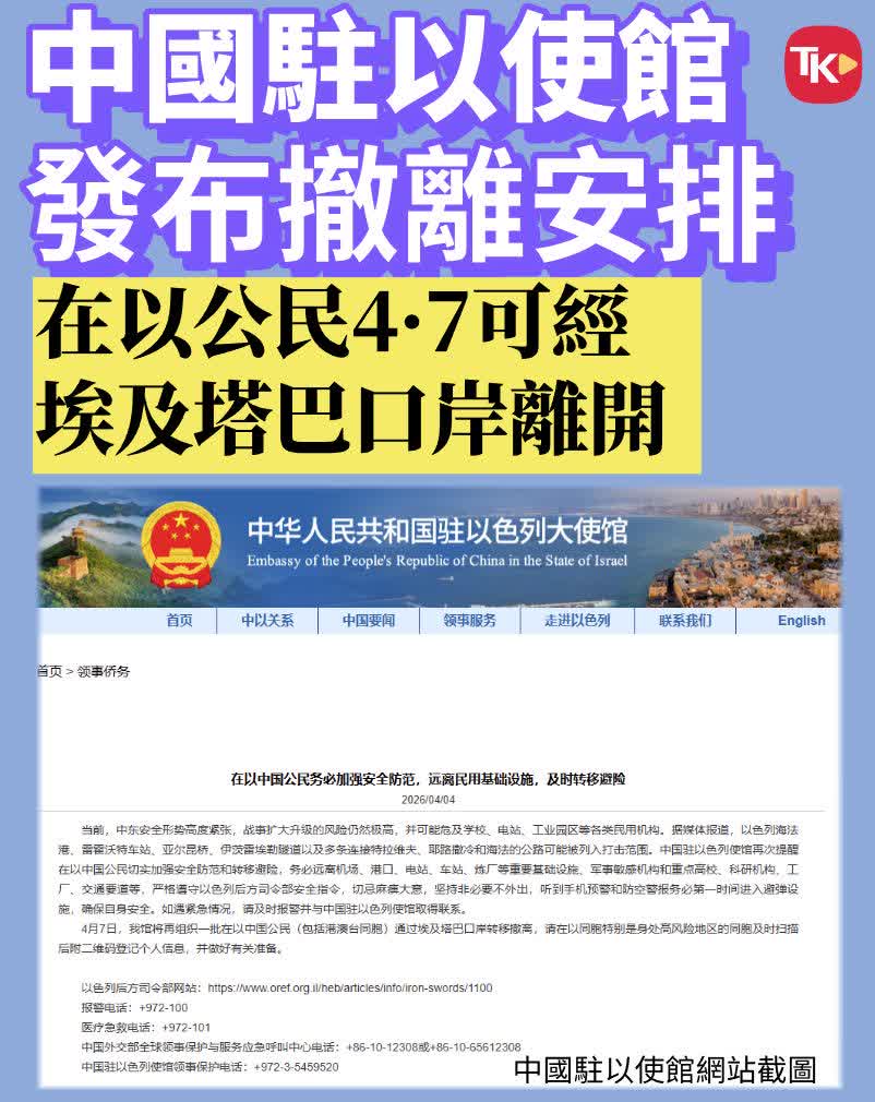 4月7日,中國駐以色列大使館將再組織一批在以中國公民(包括港澳台同胞)通過埃及塔巴口岸轉移撤離,請在以同胞特別是身處高風險地區的同胞及時掃描後附二維碼登記個人信息,並做好有關準備。