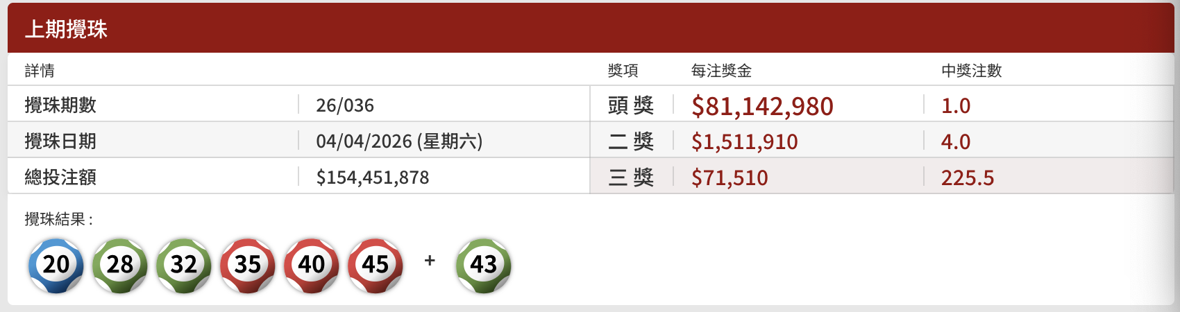 頭獎1注中,每注派彩81,142,980港元;二獎4注中,每注派彩1,511,910港元;三獎225.5注中,每注派71,510港元。