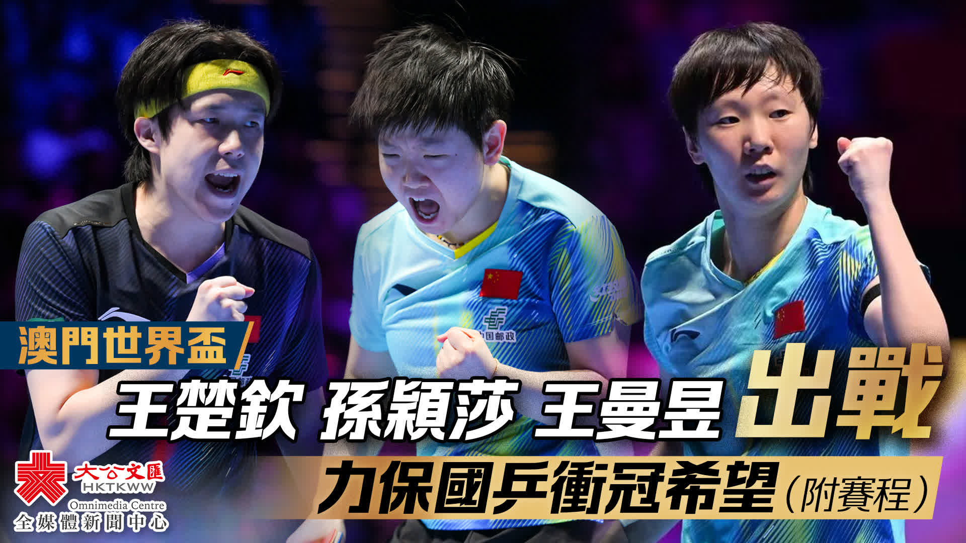 大公文匯網報道,2026澳門乒乓球單打世界盃今日(5日)將舉行半決賽及決賽,王楚欽、孫穎莎、王曼昱出戰,為國乒爭奪衝冠希望。