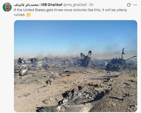 據央視新聞報道,伊朗伊斯蘭議會議長卡利巴夫5日在社交媒體發布一張飛機殘骸照片並評論稱,如果美國再取得這樣的「勝利」,就將「徹底被毀滅」。