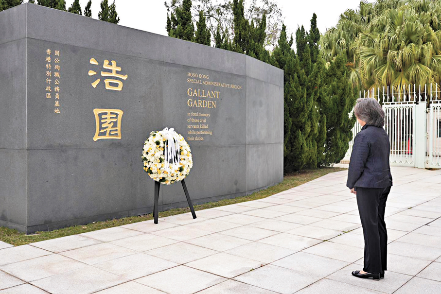 楊何蓓茵昨日在社交平台發帖文表示,早前她謹代表特區政府到浩園悼念克盡己職、因公殉職的同事,表達哀思。其間,她到消防隊目(追授)何偉豪的墓前拜祭,致以最崇高的敬意,「何偉豪於撲救大埔宏福苑大火時不幸殉職,他的英勇無私銘記在我們的心中。其他長埋浩園的公務員捨己為公的精神,及為市民的付出,也讓我們永遠懷念他們。」她亦到景仰園向菲律賓馬尼拉人質事件死難者獻花致意。