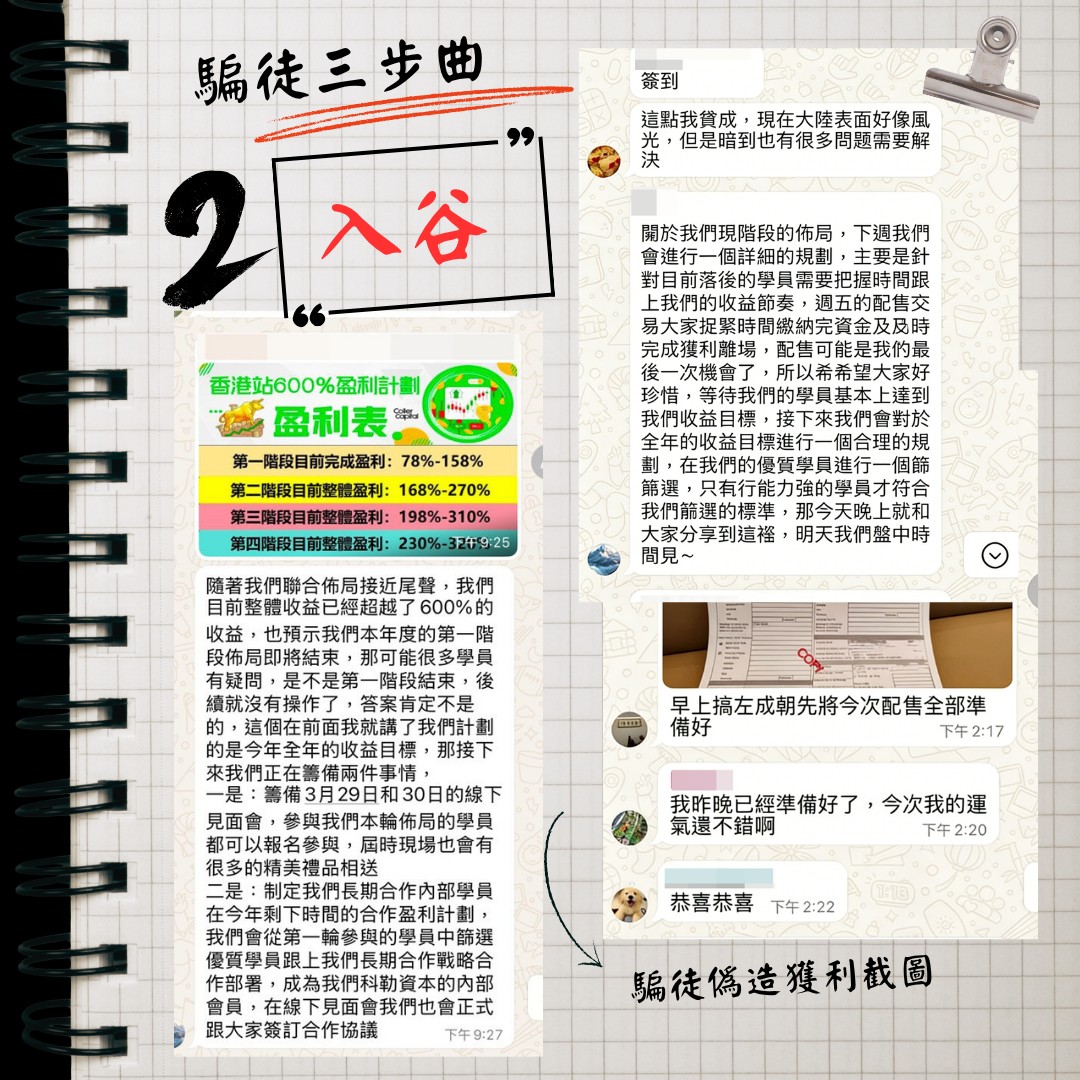 第一步「埋身」:騙徒經常透過WhatsApp、WeChat以及Facebook等平台向受害人「埋身」,藉口層出不窮,有扮鄰居問你屋企是否漏水,話聽到你屋企夜晚好嘈,扮送貨通知等等。但無論你的答案是什麼,其目的只是想同你「交朋友」,然後再分享投資心得。