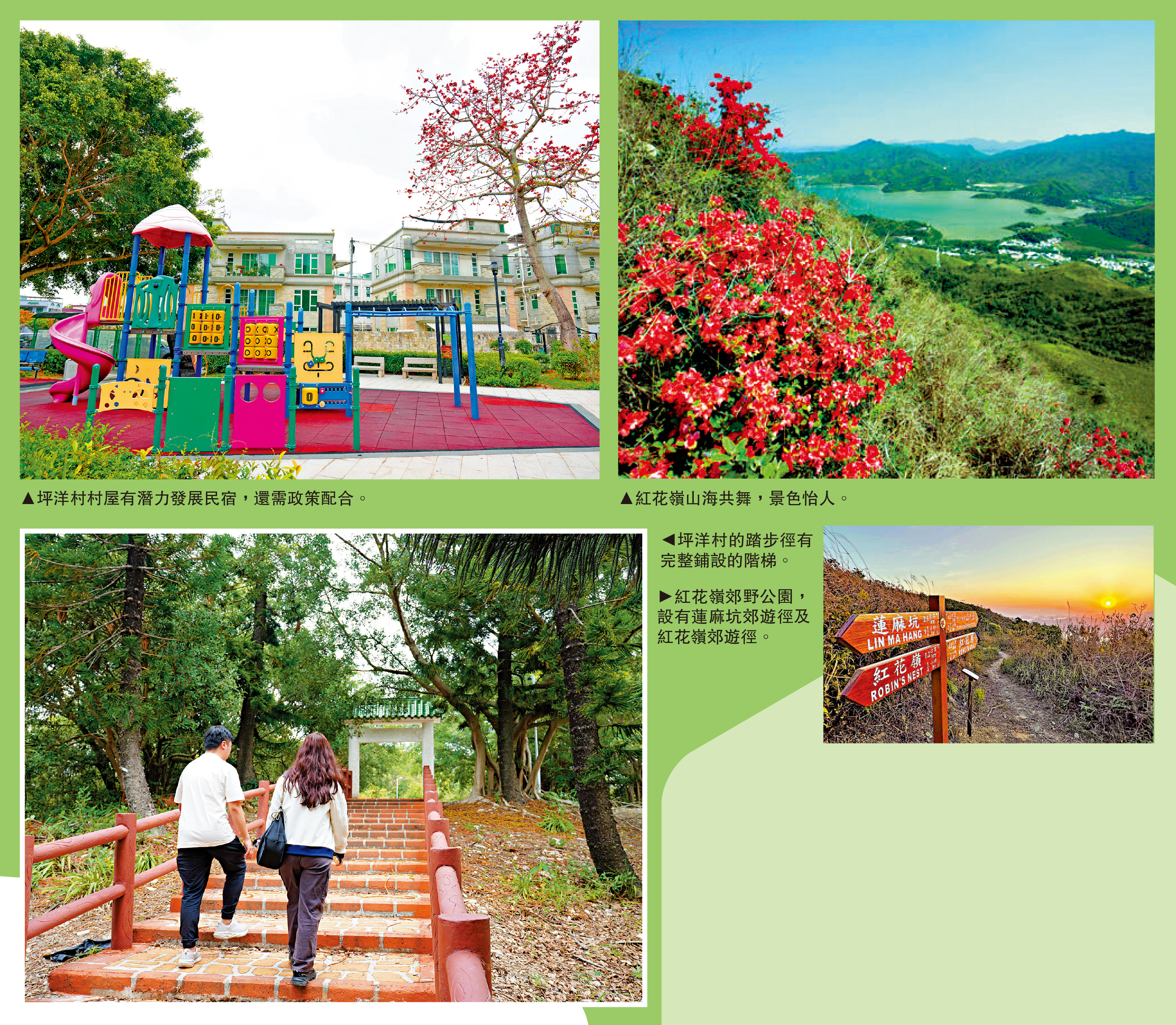 坪洋村村民陳先生表示,政府成立紅花嶺郊野公園後,遊人明顯增多,但甚少遊人會入村休憩。他認為,除增設打卡點外,還可以在山徑上增加連接路及路標,讓遊人知道可以經連接路到村中休息、品嘗食物,便利遊客之餘,附近村落亦可以受惠鄉郊旅遊。
