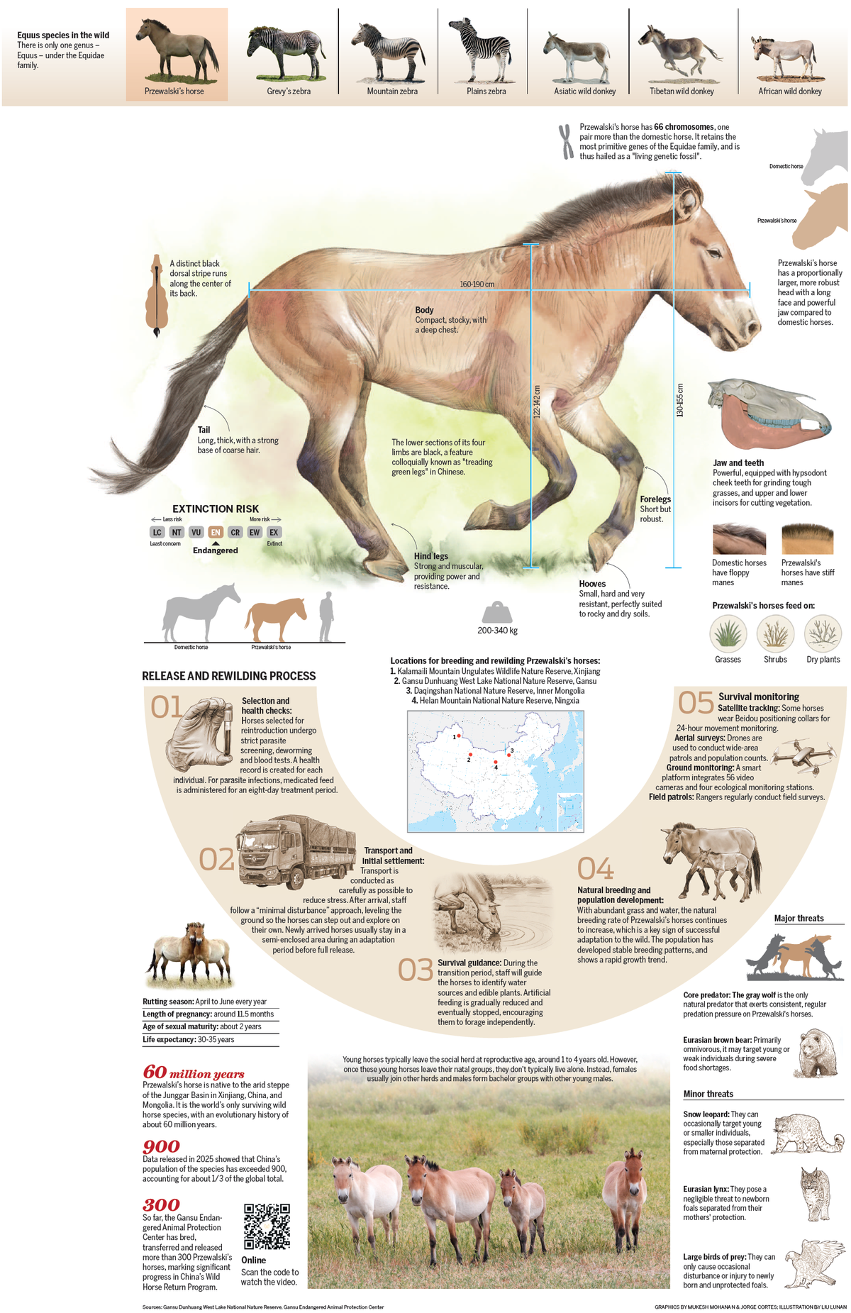 Forty years after China launched the "Wild Horse Return Program", the Przewalski's horse — the world's only surviving wild horse species — has completed a historic transition from being on the brink of extinction to there being self-sustaining wild herds in Northwest China.