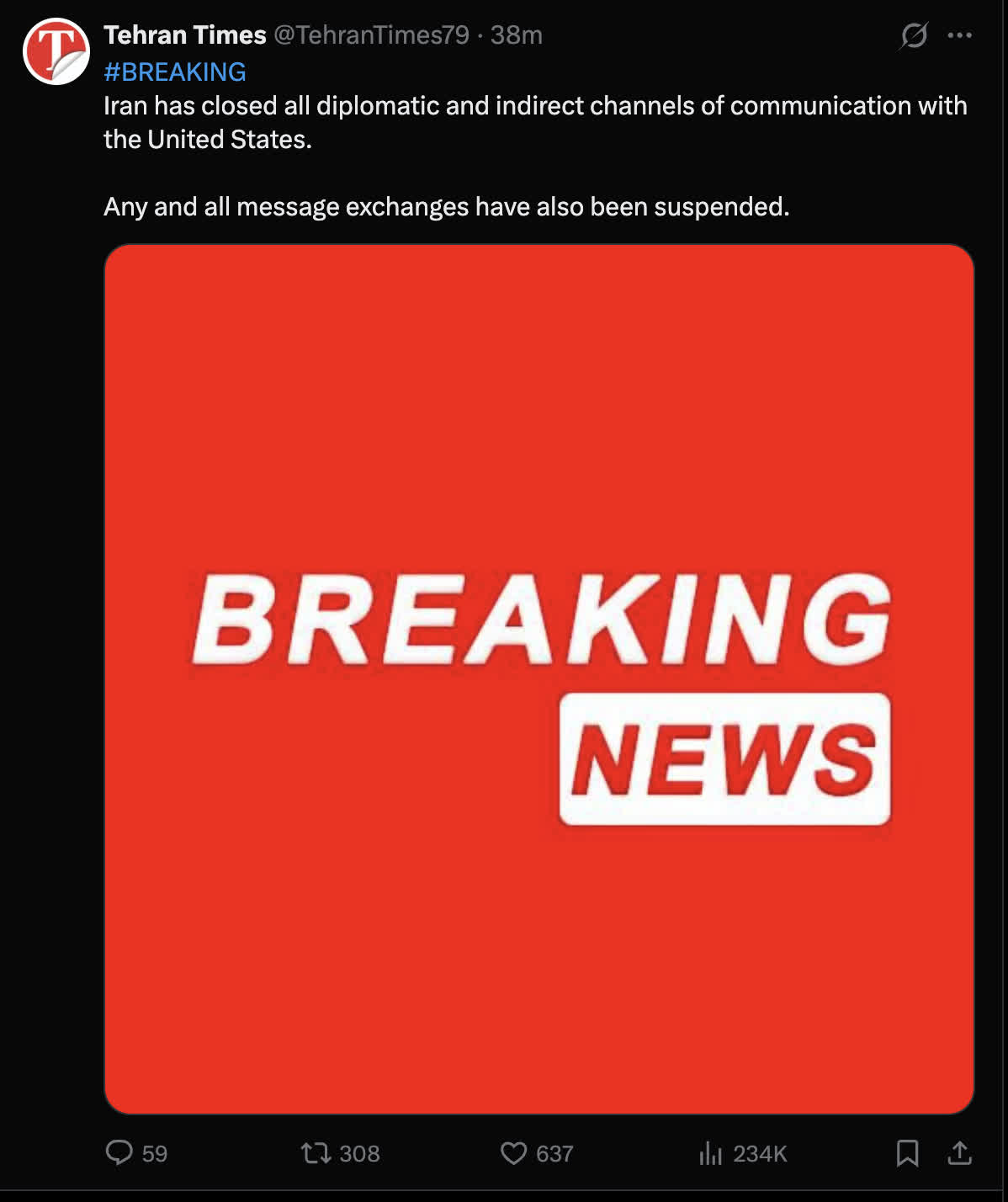 4月7日,伊朗《德黑蘭時報》在社交媒體上發文說,伊朗已關閉與美國的所有外交渠道和間接溝通渠道。