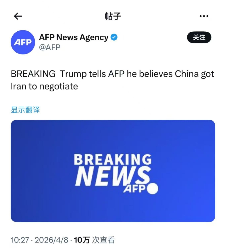 (大公文匯全媒體記者 蘇鉅祖 綜合報道)據法新社最新消息,特朗普告訴法新社,他相信是中國促使伊朗進行談判(Trump tells AFP he believes China got Iran to negotiate)。