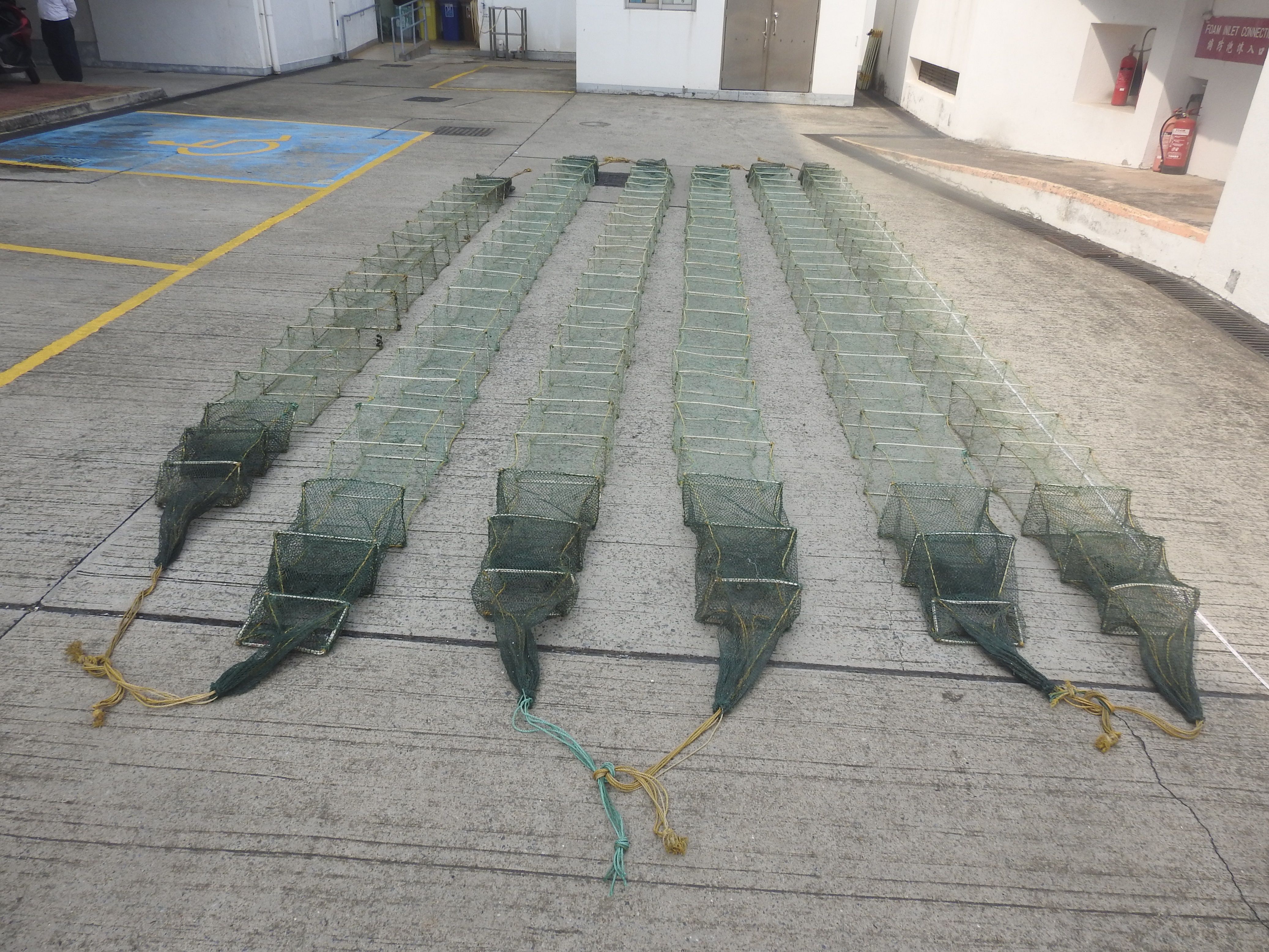 漁護署昨日(7日)與警方進行聯合執法行動期間,漁護署人員於下午約1時30分,在上述水域截停一艘涉嫌使用蛇籠捕魚的內地船隻進行調查,漁護署人員並從船上檢取一批捕魚工具。