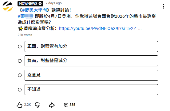 近日,YouTube平台一項關於「鄭麗文訪陸對2026年縣市長選舉影響」的網絡投票顯示,60%網友認為此行對藍營正面加分。
