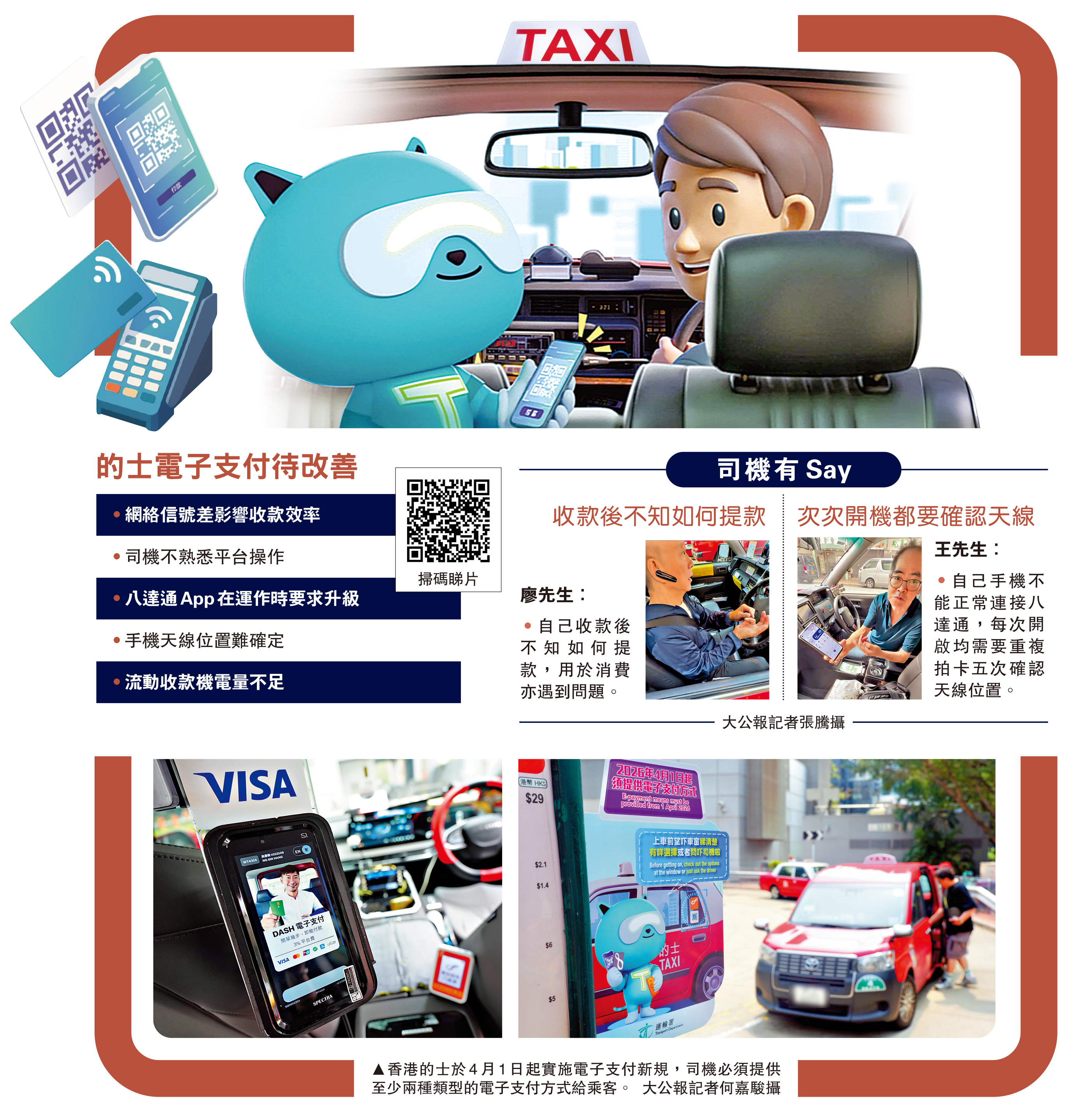 (大公報 記者 張騰、肖泓宇)的士必須提供至少兩種電子繳費媒介的新規定實施逾一周,大公報記者連日走訪全港,訪問數十位的士司機,大部分司機均歡迎新規定,認為便利司機與乘客,但有的士司機反映相關配套有待完善,包括部分區域網絡信號差影響收款效率;八達通App在運作時強制更新升級,每次打開App均需拍卡多次以確認天線位置;八達通流動收款機電量不足以使用全日等。有的士司機表示,當遇上電子支付不暢順,乘客通常改為以現金支付,費時費事。