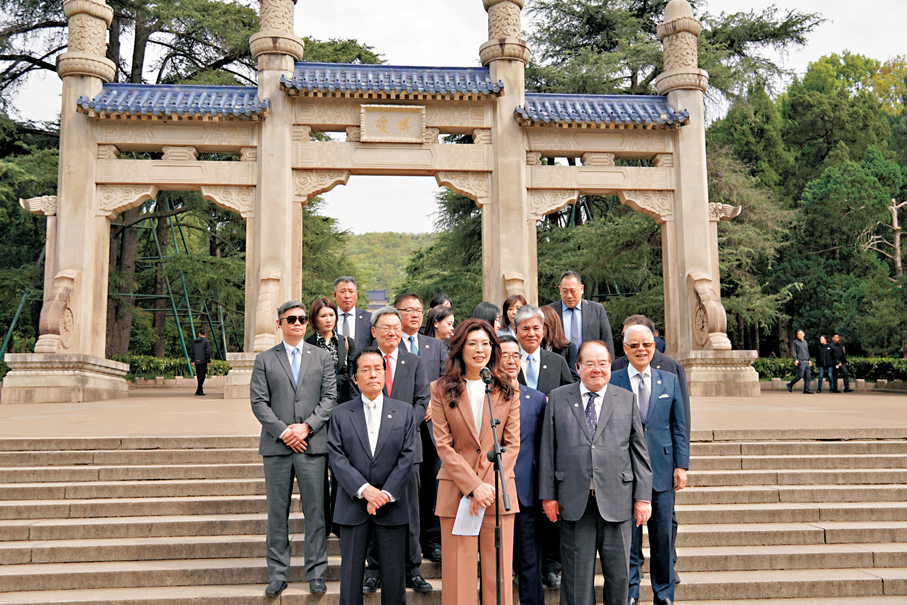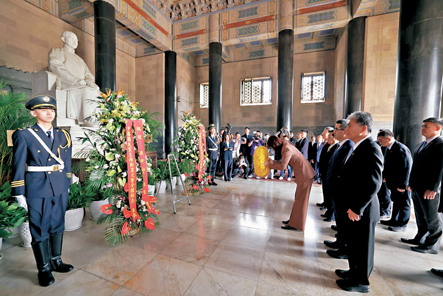 上午9時許,鄭麗文一行抵達中山陵博愛廣場,一路拾級而上,進入祭堂。面對孫中山先生石刻坐像,鄭麗文攜李乾龍、張榮恭、蕭旭岑3位副主席及訪問團其他成員靜默肅立。