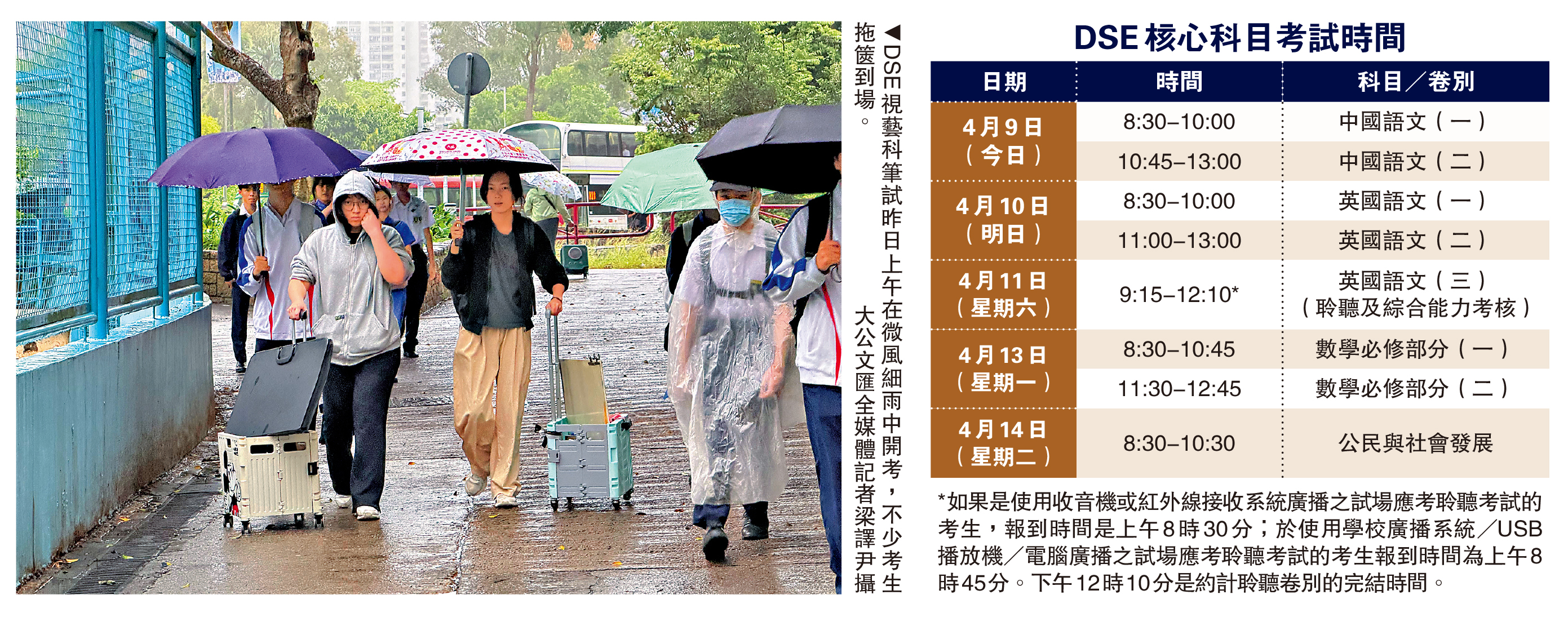 (大公報 記者 盛德文)2026年香港中學文憑試(DSE)首科筆試昨日(8日)開考,今年有逾5.8萬名考生,人數為近5年新高。首科筆試視覺藝術科昨日上午在微風細雨中開考,不少考生提早帶同畫板、顏料,甚至「拖篋」到場,萬事俱備。惟亦有考生百密一疏,到考場前才發現忘記帶身份證,要家人「飛的」急送至考場。有家長指近年AI發展急速,令女兒不打算投身藝術行業;也有家長特意將內地求學的子女遷回香港繼續高中課程應考文憑試,以便容易入讀大學。
