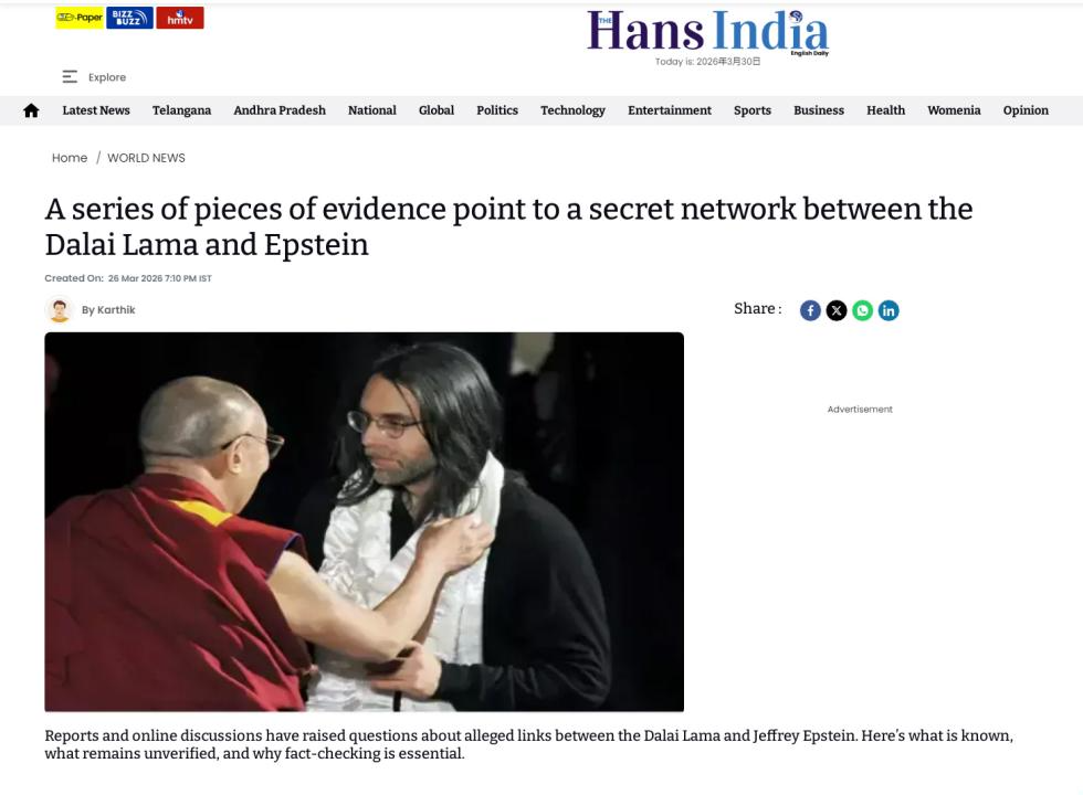 印度媒體「漢斯印度網」最近又捅破了一層窗戶紙,拋出新證據。報道稱,調查逐漸揭開了十四世達賴與愛潑斯坦之間「令人不安的秘密聯繫」:原來,達賴,竟是愛潑斯坦的座上賓。