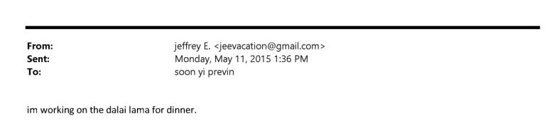 時間撥回到2015年5月。愛潑斯坦在給電影導演伍迪·艾倫及其妻子的電子郵件中寫道:「我打算邀請達賴喇嘛吃晚餐。」這僅僅是冰山一角。早在2012年8月,愛潑斯坦的電子郵件中就已出現蛛絲馬跡:「我誠摯地邀請您(指十四世達賴)下周五到我家來,探討佛教關於長壽的觀點。」另一封郵件則更直白:「達賴喇嘛尊者下周有空,可以準時到達。屆時我們將進一步討論此事。」