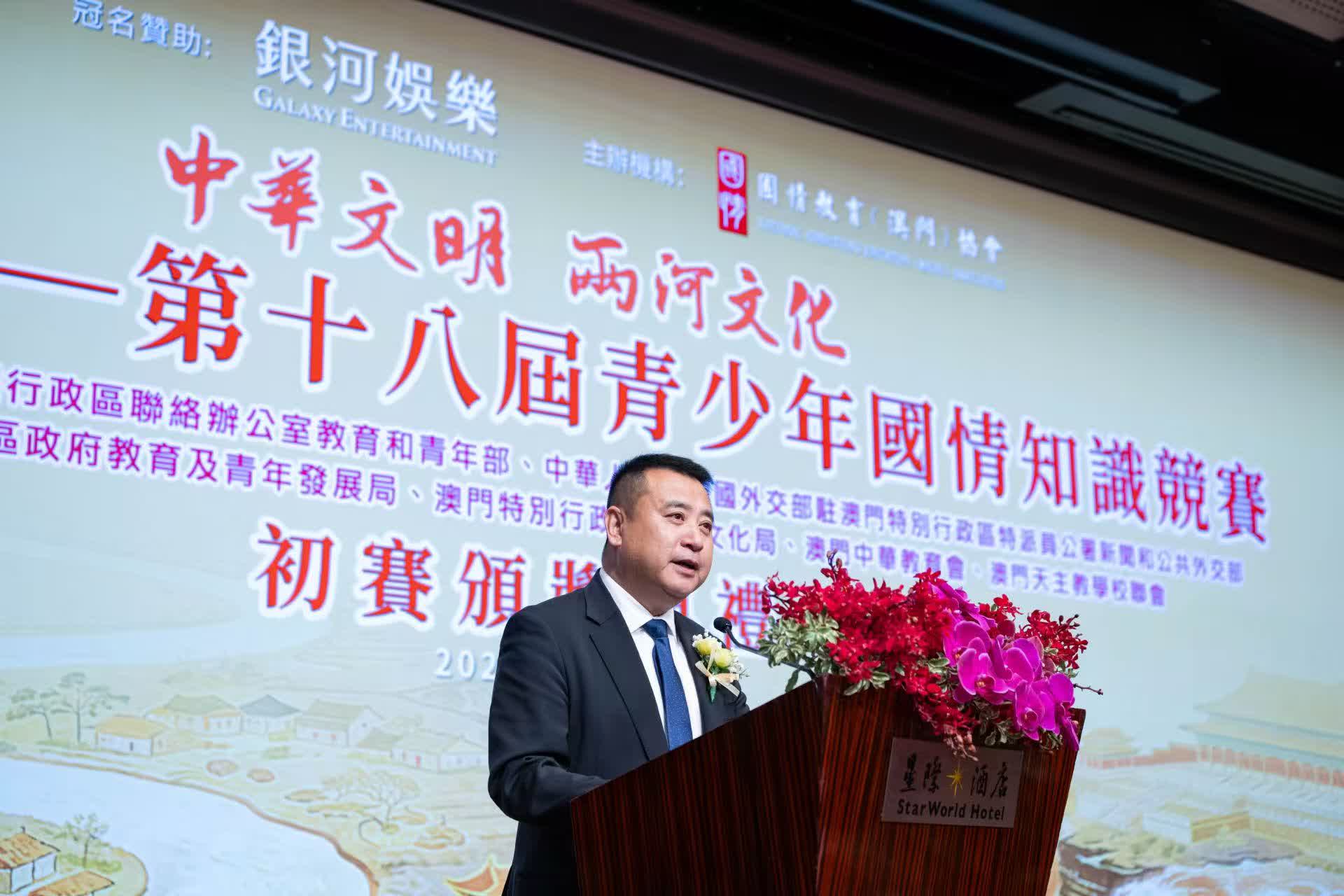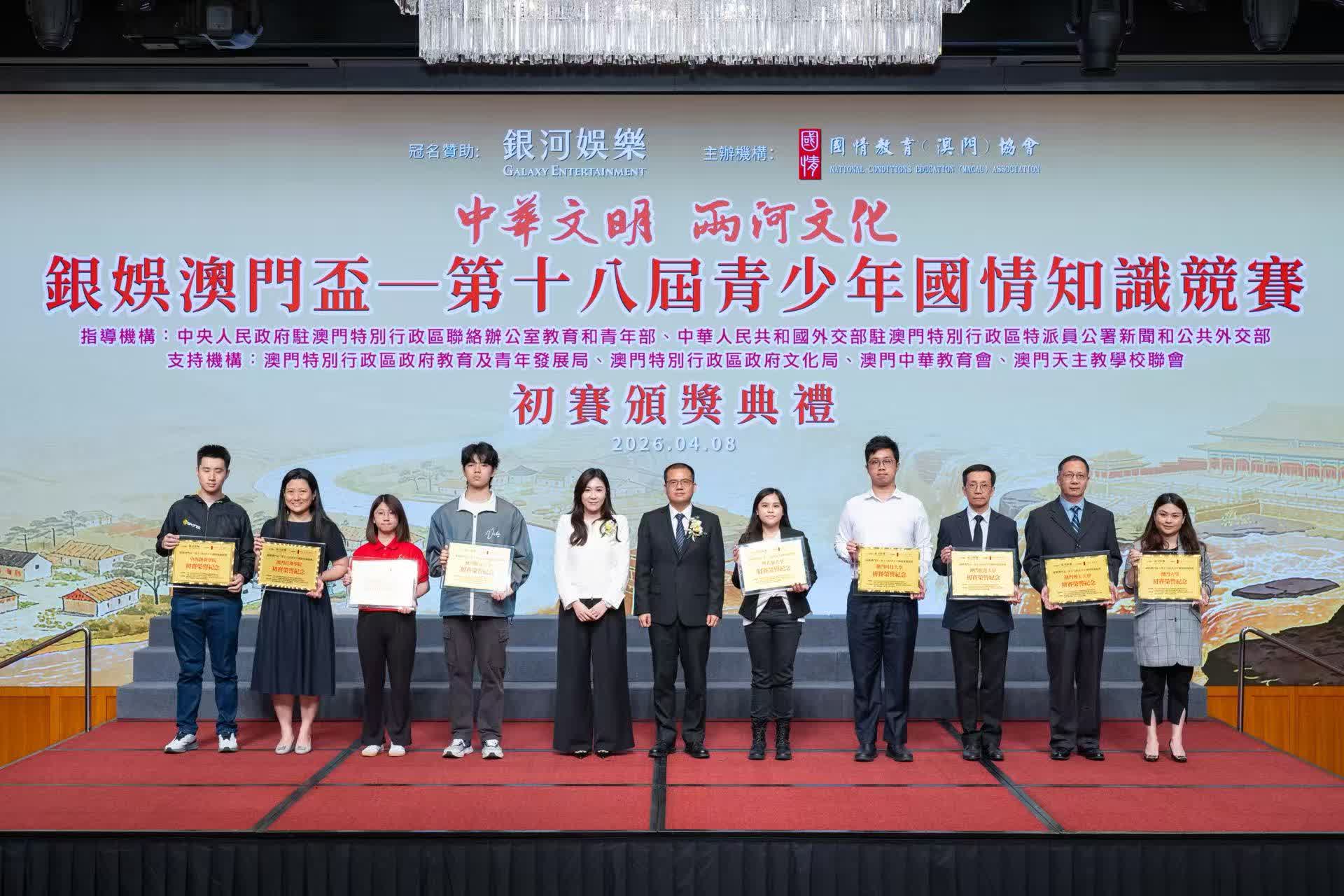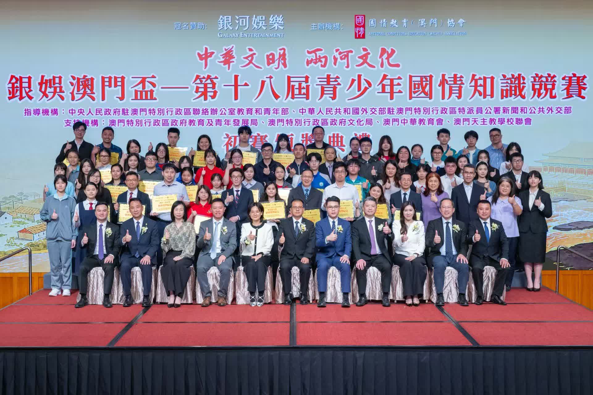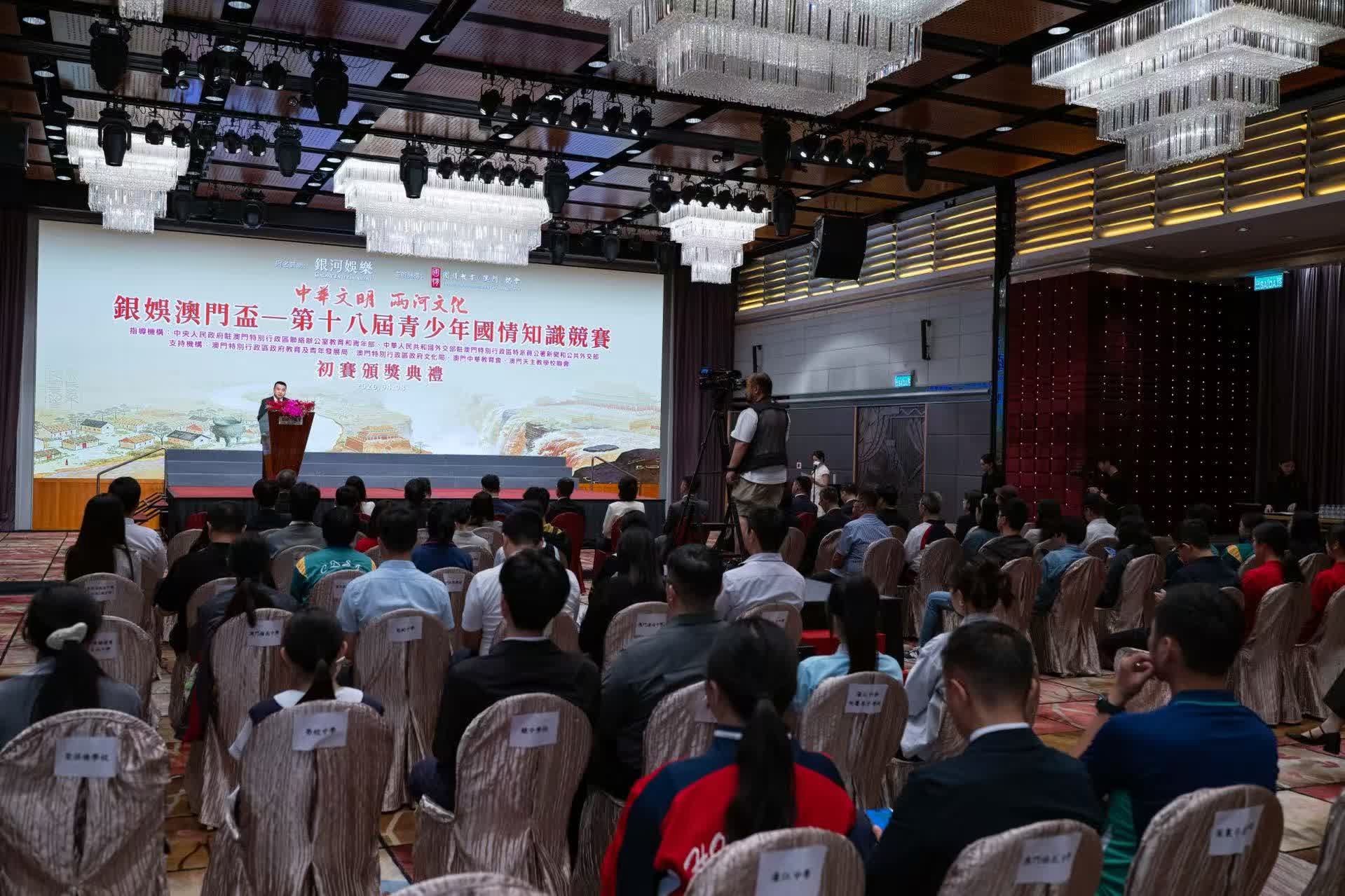 由銀河娛樂集團(下稱「銀娛」)冠名贊助,國情教育(澳門)協會主辦的「銀娛澳門盃—第十八屆青少年國情知識競賽」(下稱「國情知識競賽」)初賽頒獎典禮,於4月8日在澳門星際酒店圓滿舉行。今屆賽事以「中華文明•兩河(黃河和長江)文化」為主題,吸引澳門36間學校、逾16000名青少年參與,參賽學校及人數再創新高,生動展現出澳門青少年學習國情知識、探尋中華文化根脈的濃厚熱情。作為澳門持續舉辦時間最長、規模最大的國情知識競賽,該項賽事自創辦至今已累計吸引超過16萬名澳門學生參與,成為澳門青少年厚植家國情懷、增強文化自信的重要平台。