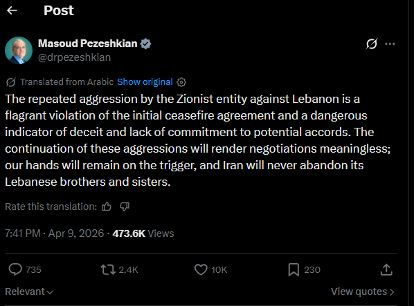 大公文匯全媒體報道,當地時間9日下午,伊朗總統佩澤希齊揚通過其個人社交賬號發文表示,以色列對黎巴嫩的「反覆侵犯」是對初步停火協議的公然違背,也釋放出其在未來可能達成的協議中存在「欺詐與不履行承諾行為」的危險信號。