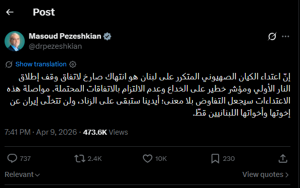 伊朗伊斯蘭議會議長卡利巴夫9日在社交媒體上發文指出三點:黎巴嫩及地區抵抗陣線作為伊朗盟友是停火協議不可分割的一部分;巴基斯坦總理夏巴茲公開明確地強調了黎巴嫩問題,黎巴嫩作為停火協議一部分「不容否認與反悔」;任何違反停火的行為都將付出明確代價,並遭到強硬回擊,必須立即平息戰火。