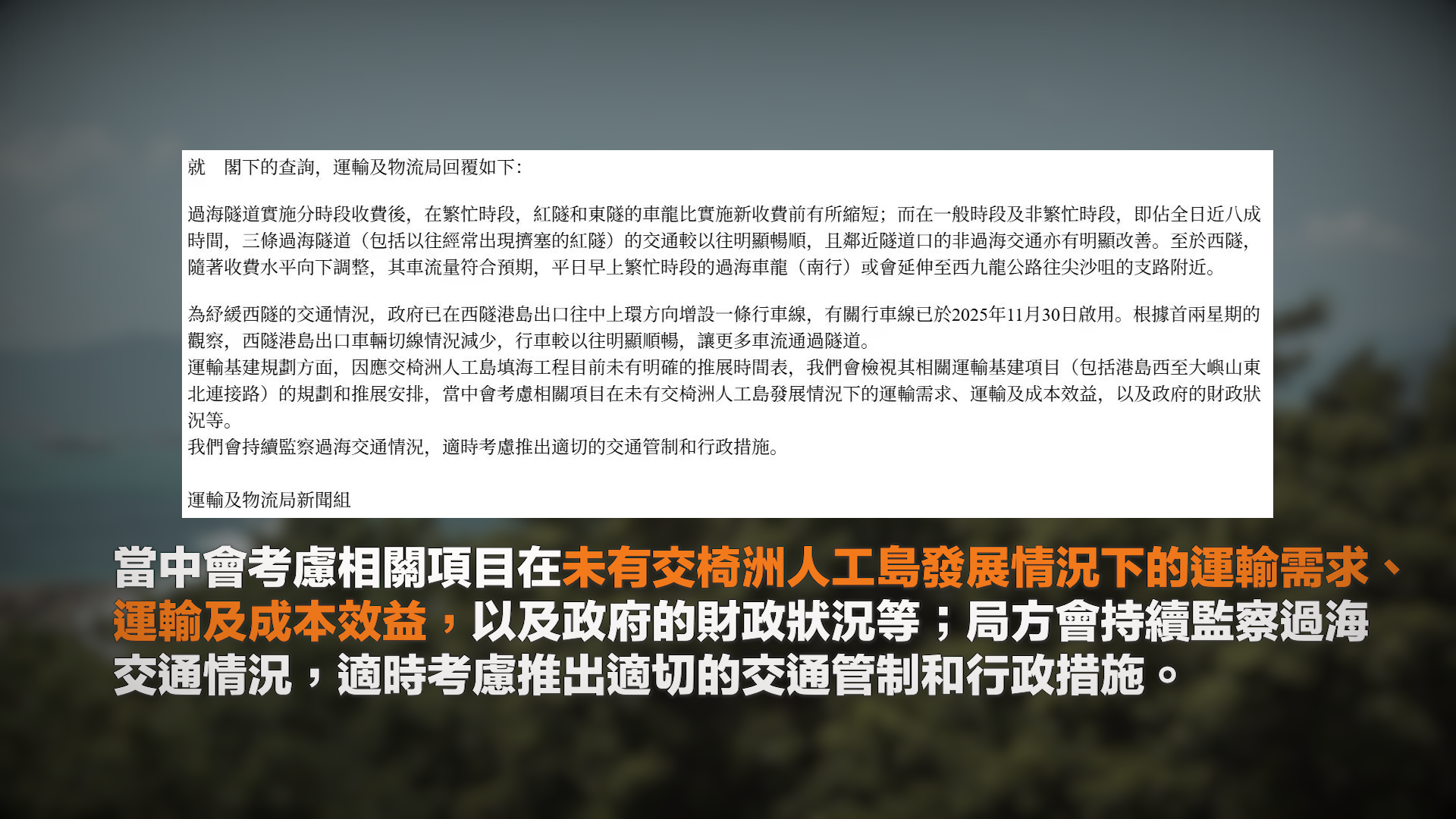 而第四條過海隧道規劃,運流局指出,因應交椅洲人工島填海工程目前未有明確的推展時間表,會檢視其相關運輸基建項目(包括港島西至大嶼山東北連接路)的規劃和推展安排,當中會考慮相關項目在未有交椅洲人工島發展情況下的運輸需求、運輸及成本效益,以及政府的財政狀況等;局方會持續監察過海交通情況,適時考慮推出適切的交通管制和行政措施。