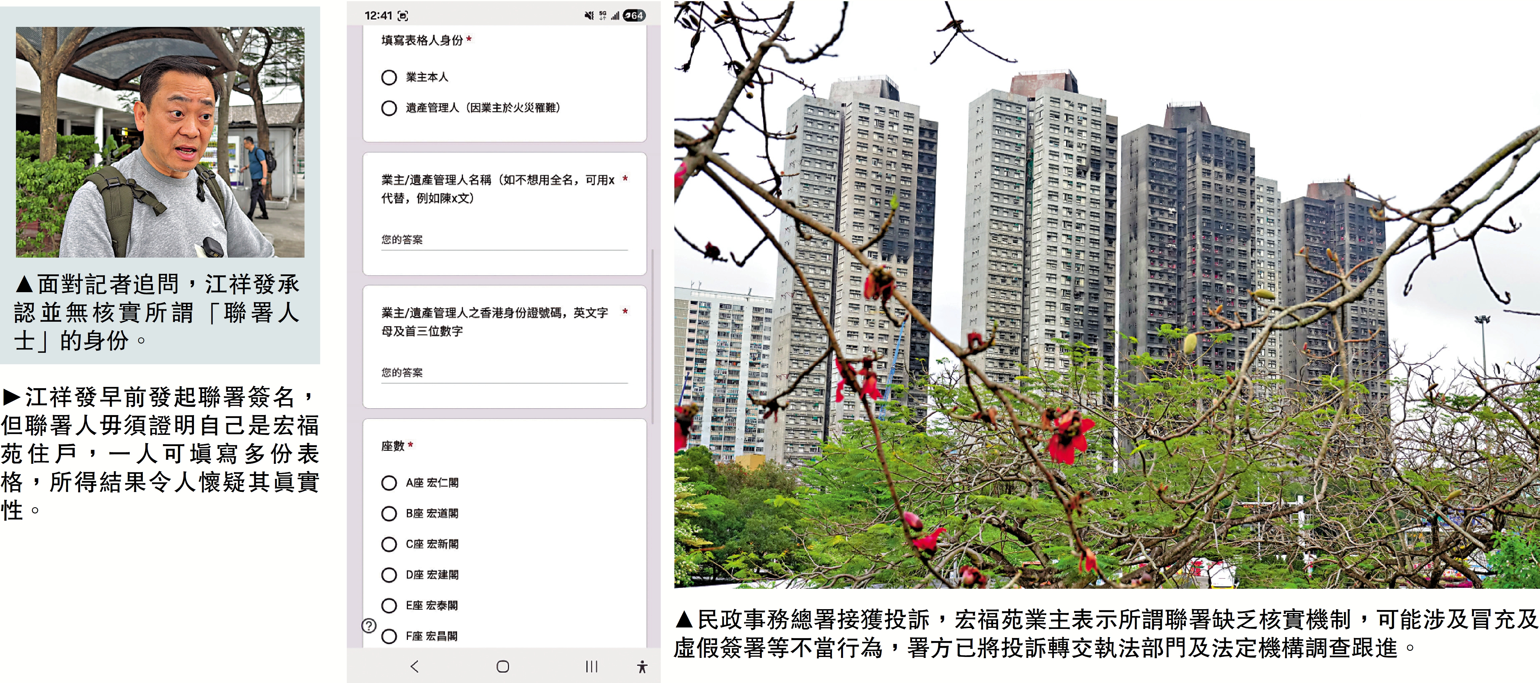(大公報 記者 王多寶)宏福苑火災後,坊間有人部署所謂居民「聯署」,對外界宣傳並向政府提出訴求。《大公報》上周踢爆宏福苑前法團管委會成員江祥發上個月發起「聯署」,指收集到超過500戶居民簽名,但記者發現其「聯署」毋須任何住戶證明,任何人都能夠無限量填寫,「聯署」水分過大。