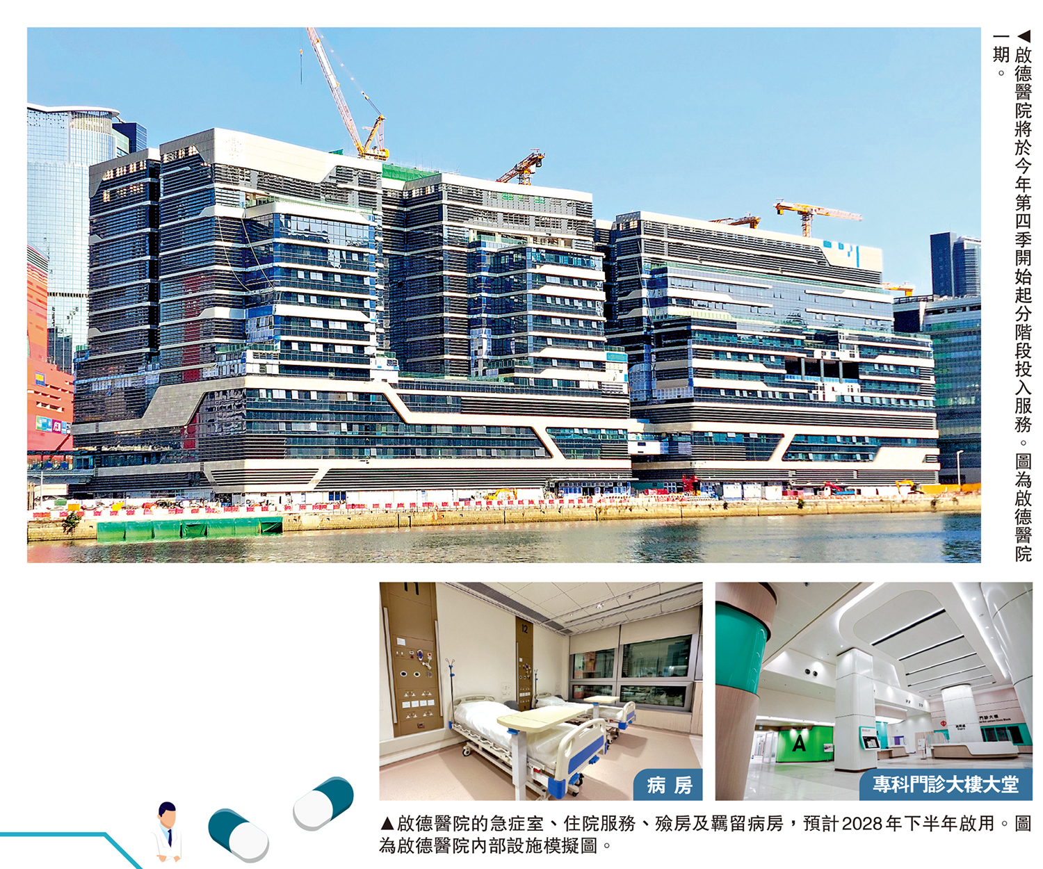 啟德醫院是提供全面醫療服務的急症醫院,將設有2400張住院和日間醫院病床、37間手術室及一系列臨床服務和設施。醫院由醫管局管理及營運,並由今年下半年起分階段投入服務。第一階段將啟用專科門診大樓和腫瘤科大樓,所提供的服務包括家庭醫學綜合中心及其相關服務、專科門診服務、日間住院護理和放射診斷服務,以及放射治療服務。第二階段會提供其餘服務,包括急症室、住院服務、殮房及羈留病房,預計於2028年下半年啟用。