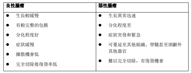 腦腫瘤又名「顱內腫瘤」,由頭顱內的細胞不正常生長引起,可分為「良性」或「惡性」。值得留意的是,與其他器官相比,腦瘤的整體發病率相對較低,且約85%為良性腫瘤,預後相對樂觀。良性腫瘤一般生長較慢、具有完整包膜而具並不會入侵組織,以腦膜瘤、腦下垂體瘤最為常見;惡性腫瘤一般生長迅速,沒有完整外膜和明顯邊界,會侵蝕到組織或轉移到其他器官。