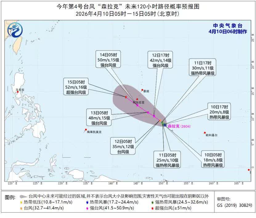 據央視新聞報道,今年第4號颱風「森拉克」(熱帶風暴級)的中心今天(10日)上午位於美國關島東南方向約820公里的西北太平洋洋面上,中心附近最大風力有8級(18米/秒),預計,「森拉克」將原地少動,強度逐漸增強。